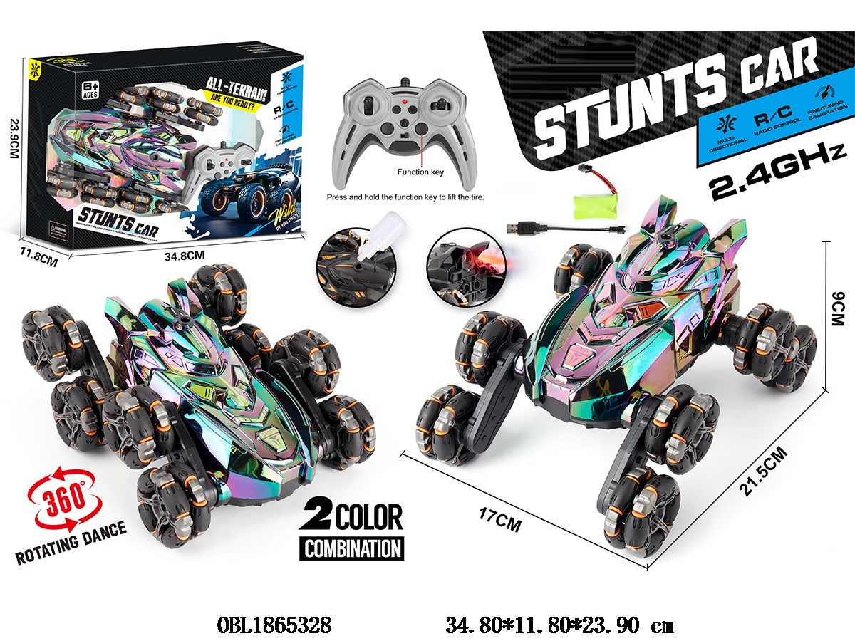 Remote control stunt car with light, spray drift, USB cable, car body, 7.4V battery pack, electric remote controller, 2 * AA, no power pack, 2.4G frequency, 2-color mixed installation