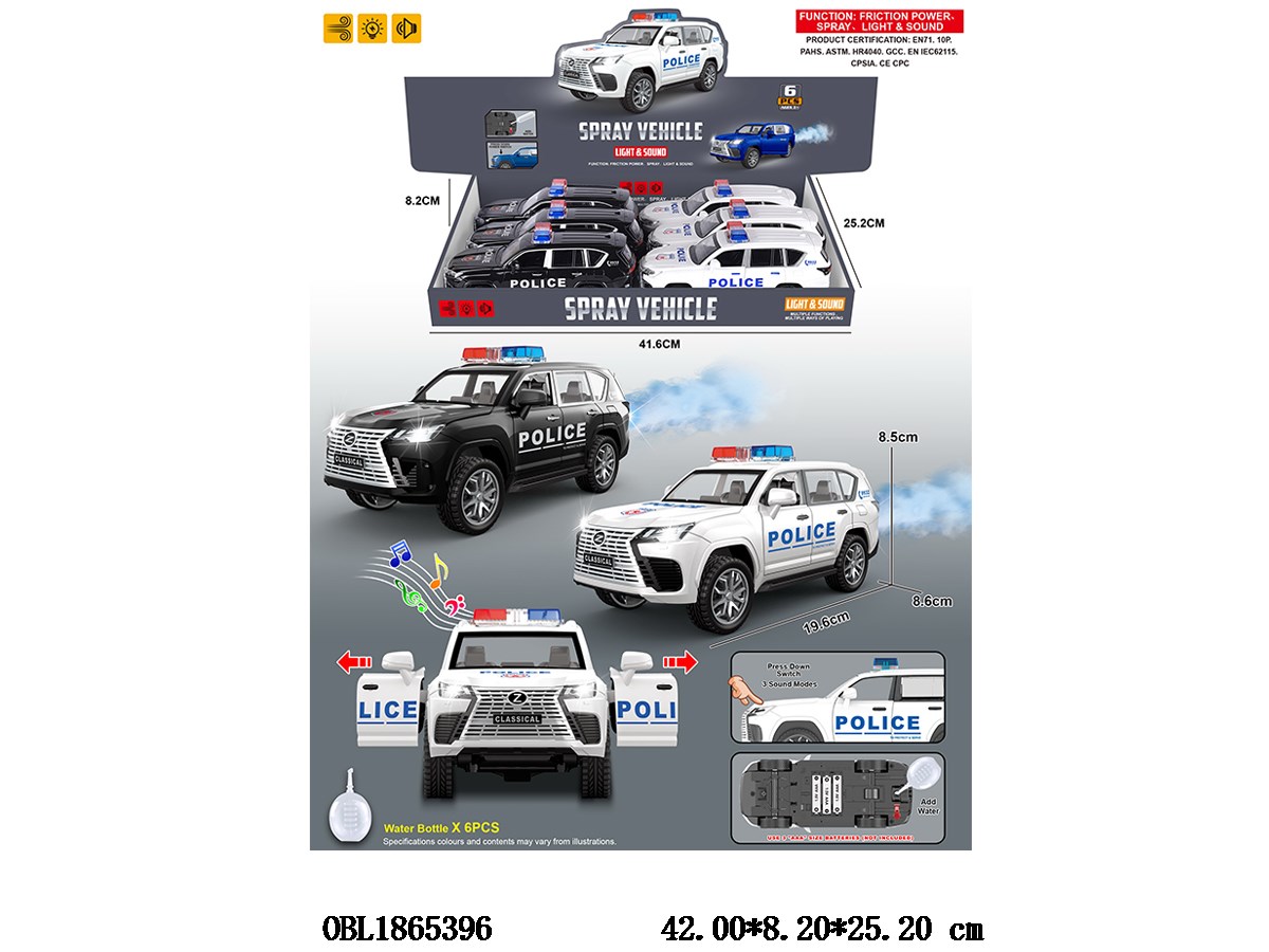 Home > F/P Car > Inertia police car with light, music, spray, openable, 3 * AAA, non electric, 2-color mixed package, 6 pieces, one display box