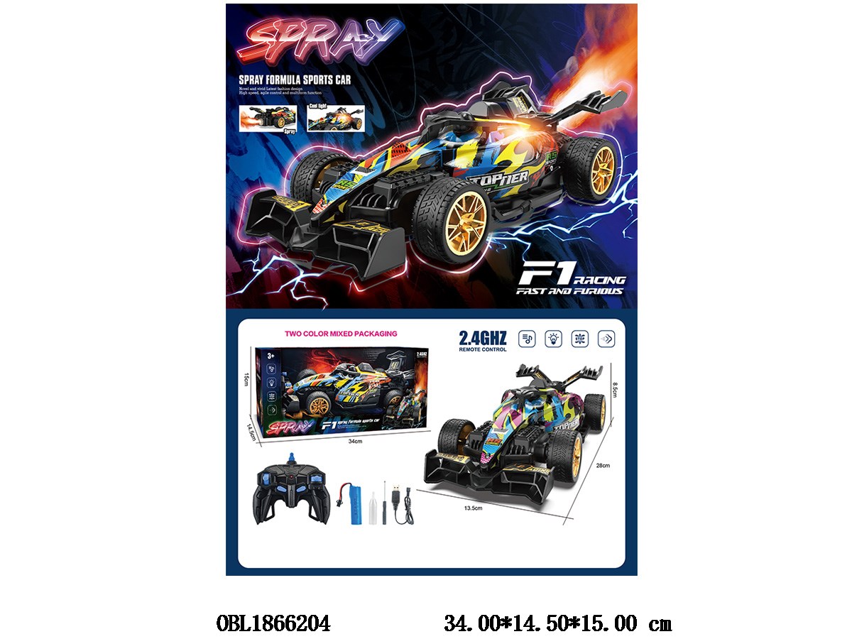 Remote control F1 racing car with light spray, USB cable, body 3.7V lithium battery pack, electric remote control, 2 * AA, no power pack, 2.4G frequency, 2-color mixed pack