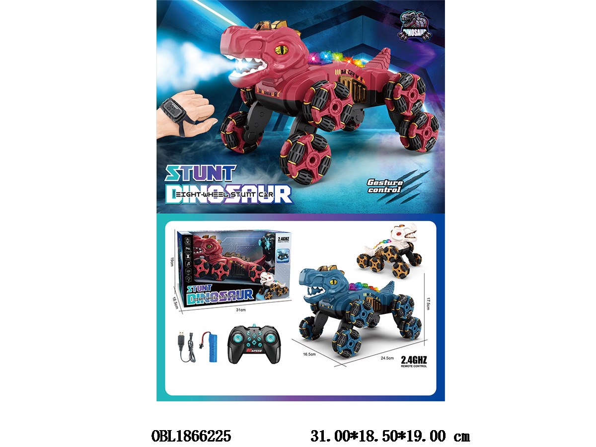 Home > R/C Car > Double remote control dinosaur stunt car with light, music, spray, USB cable, body, 3.7V lithium battery pack, electric remote control, 2 * AA, without electric watch, remote control, 2 * AAA, without electric watch, 2.4G frequency, 3-color mix