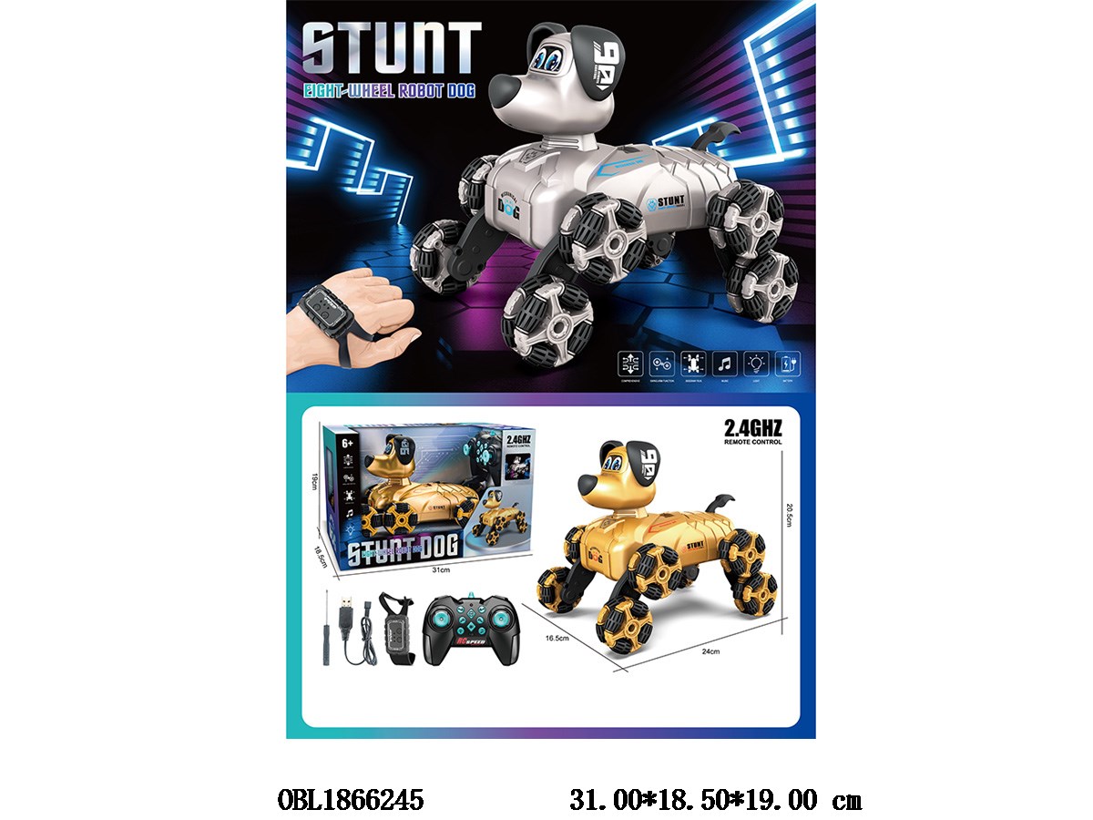 Dual remote control machine dog stunt car with lights, music, and USB cable. Body 3.7V lithium battery with power included remote control 2 * AA without power, watch remote control 2 * AAA without power, 2.4G frequency, 2 colors mixed