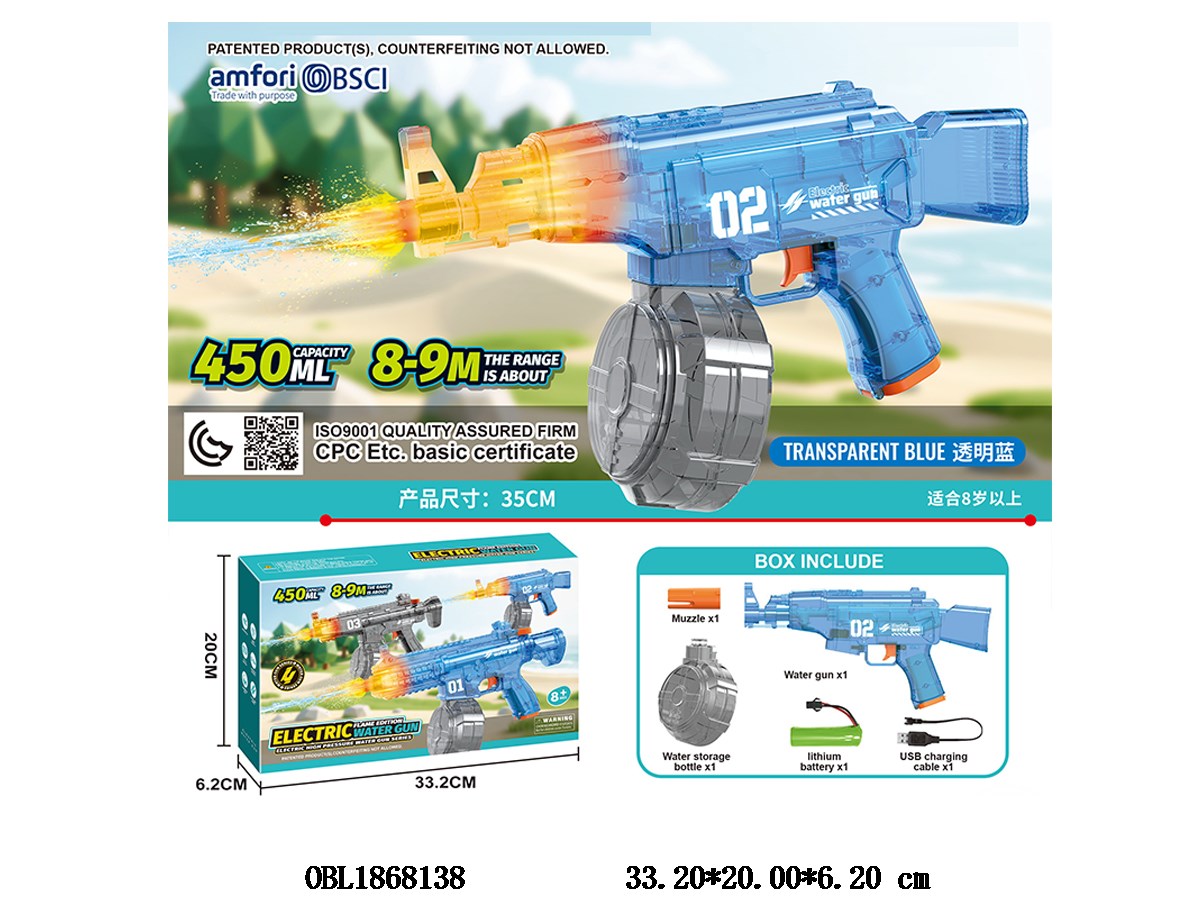 Transparent blue electric water gun with light 350ml, equipped with USB cable and 3.7V battery pack