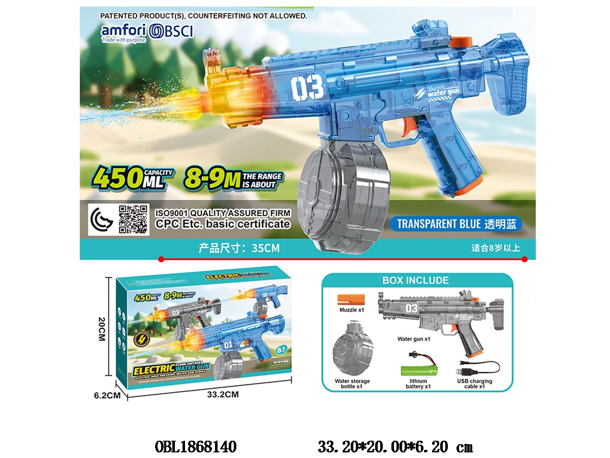 Transparent blue electric water gun with light 350ml, equipped with USB cable and 3.7V battery pack