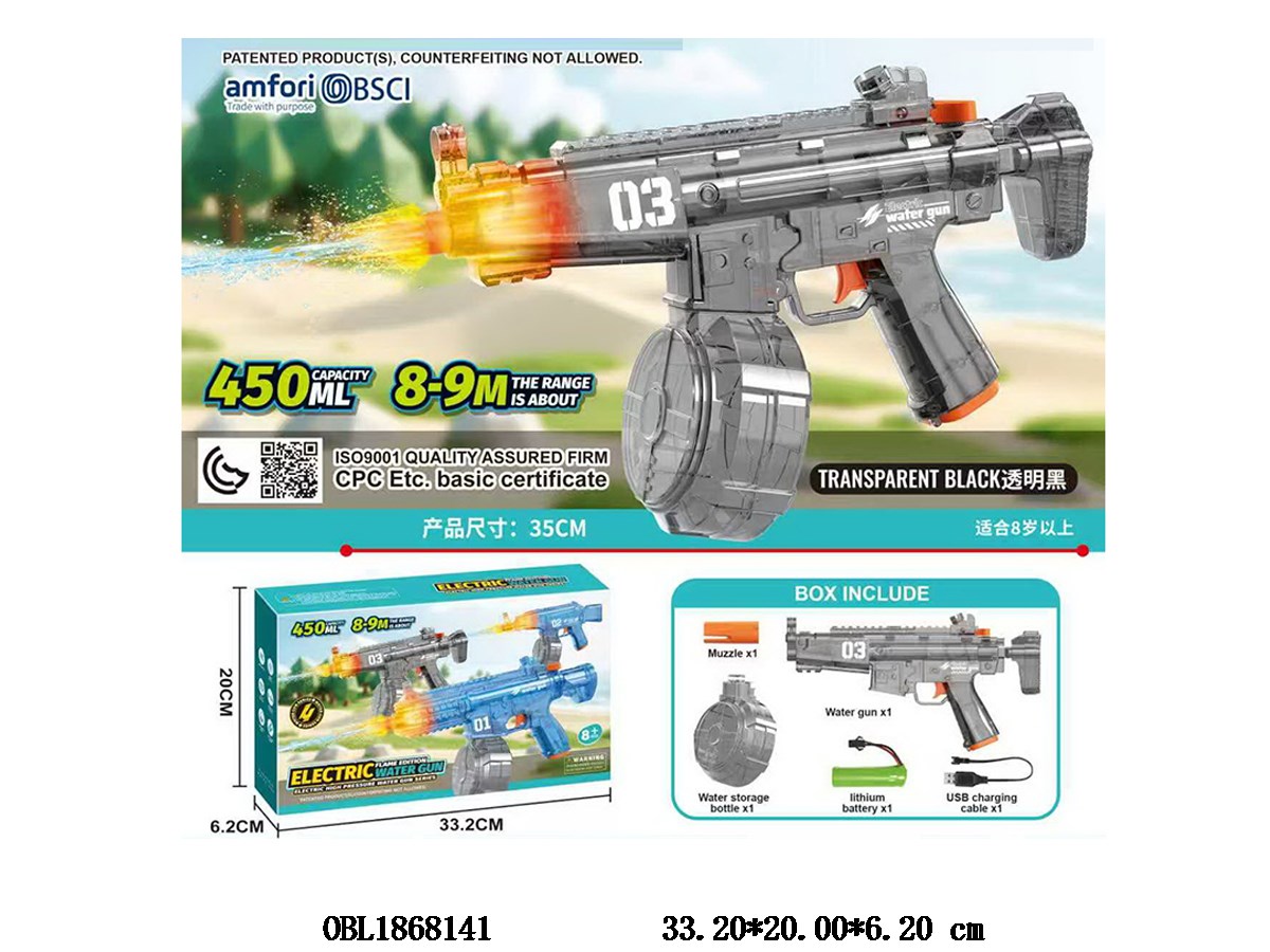 Transparent black electric water gun with light 350ml, equipped with USB cable and 3.7V battery pack