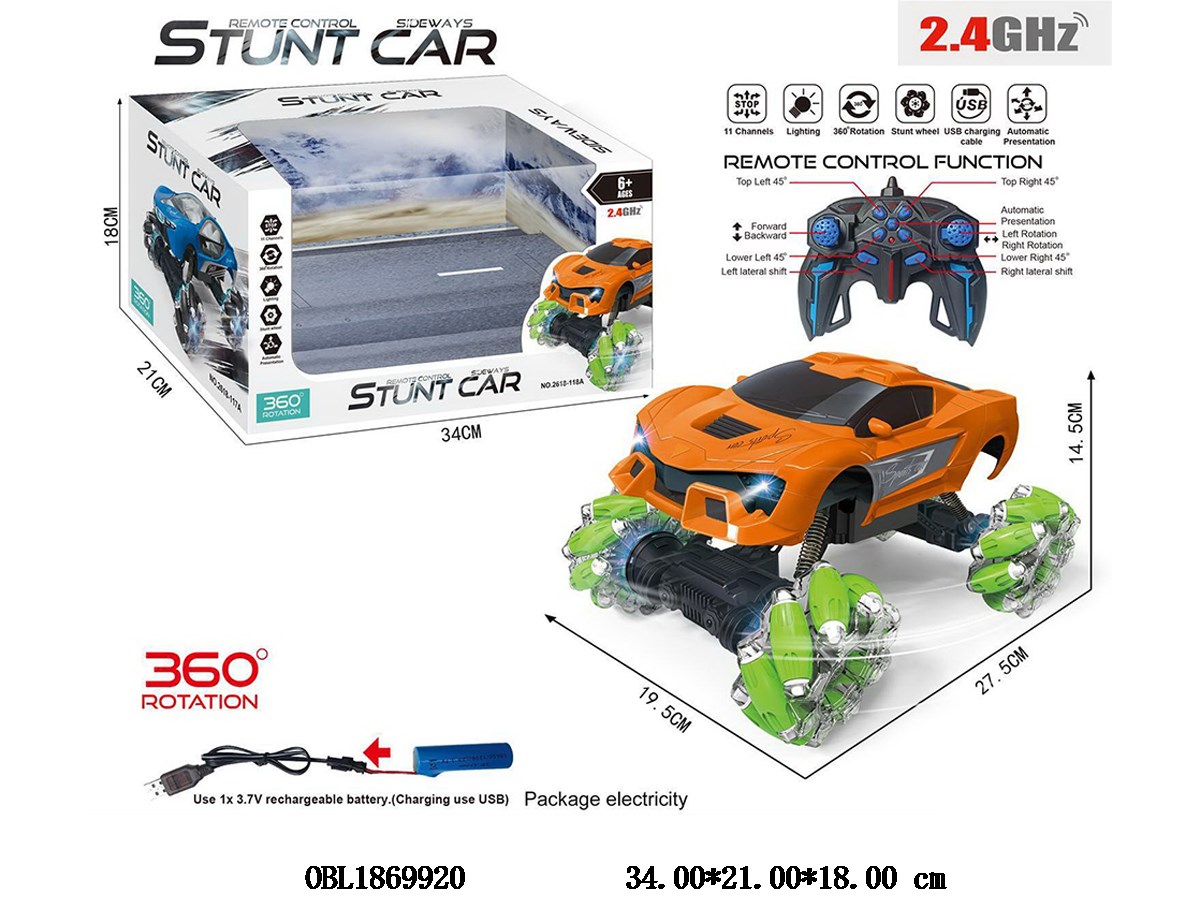 11 way remote control side stunt car with lights and USB cable. Body 3.7V lithium battery included remote control 2 * AA without power. 2.4G frequency