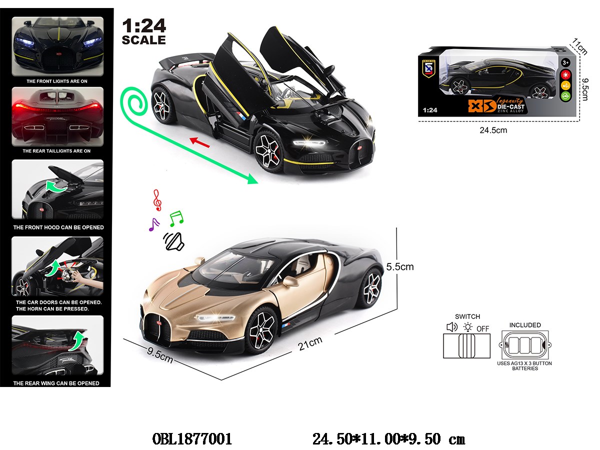 1: 32 cast zinc alloy regenerative car with lighting and music, capable of opening doors, 3 * AG13, electric package, 2 colors mixed design