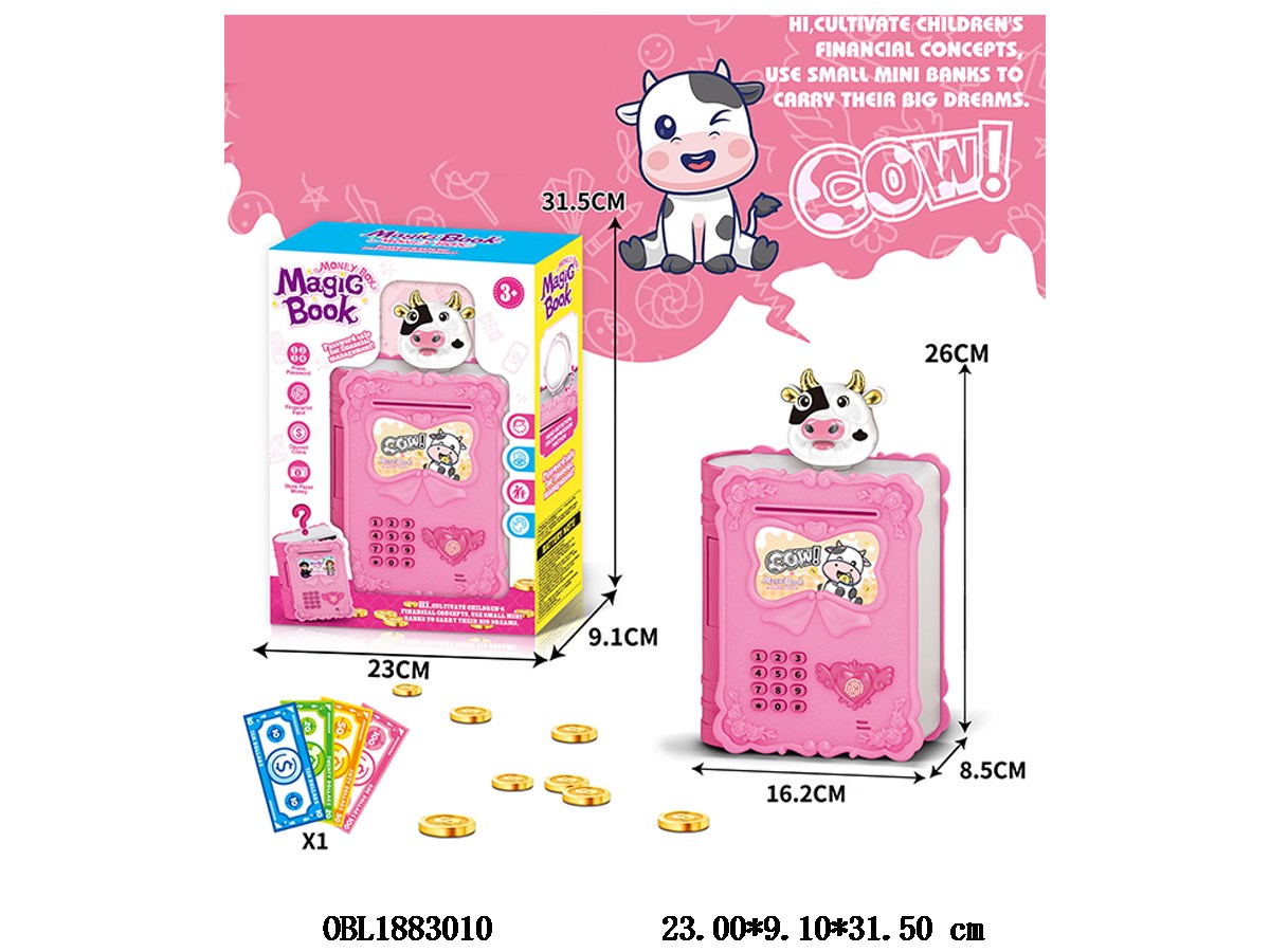 Magic book cartoon piggy bank with lighting, music, password, simulated fingerprint, automatic door opening, automatic money roll, 3 * AA, not including electricity, cow