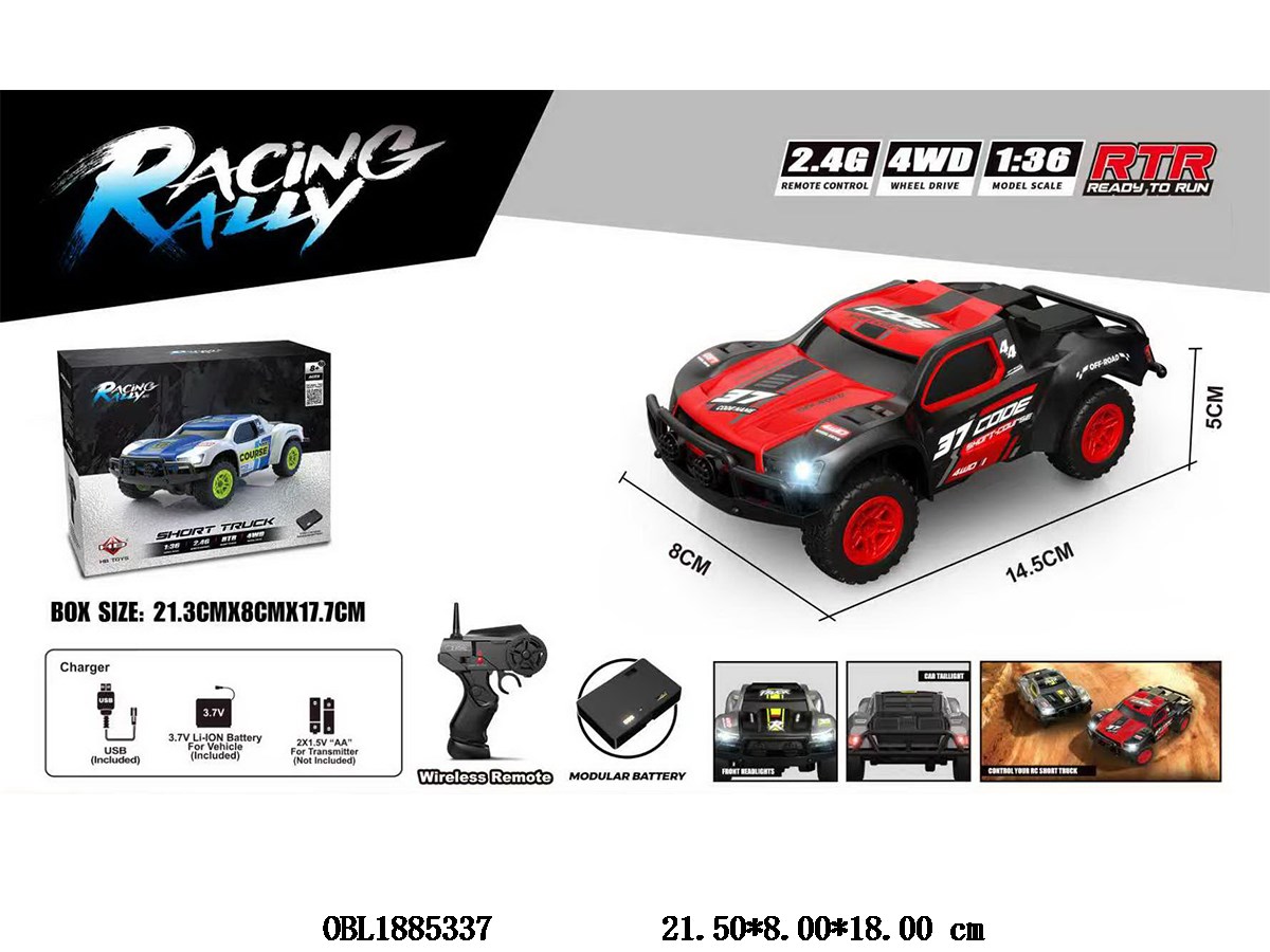 1: 36/2 ratio remote control short truck with lights and USB cable, body 3.7V soft pack battery included remote control 2 * AA without power, 2.4G frequency