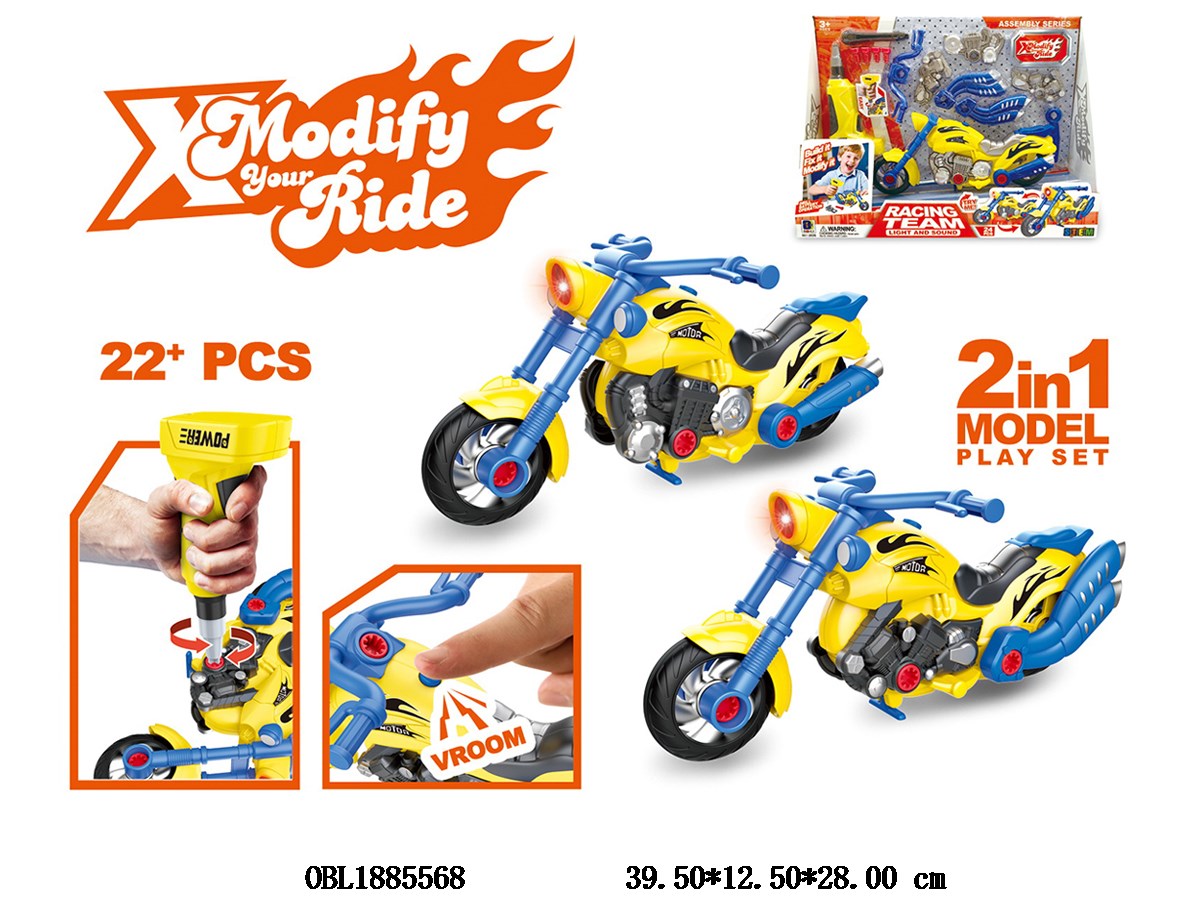 2-in-1 disassembly motorcycle set with lights and sound 2 * AG13, including electric drill 2 * AA, not including electricity