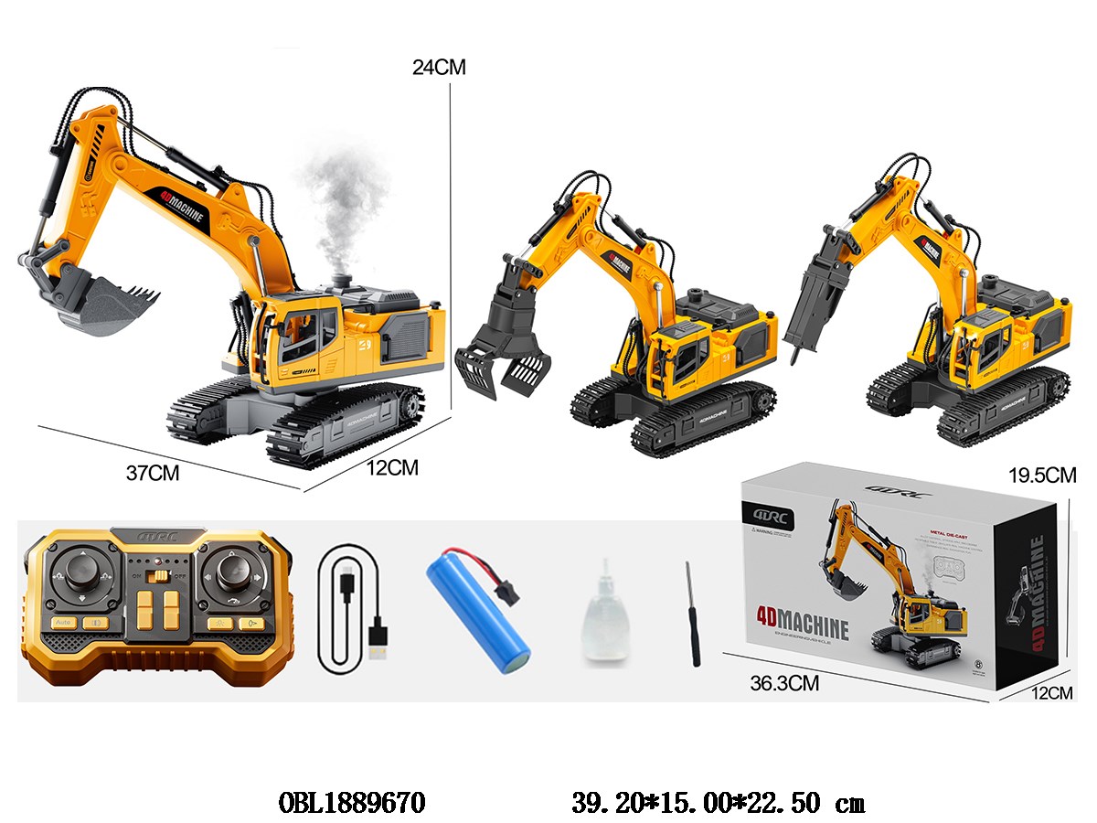 Yellow fourteen way three in one remote control alloy crawler excavator with light, music, spray, USB cable, body, 3.7V battery pack, electric remote controller, 2 * AA, no power pack, 2.4G frequency