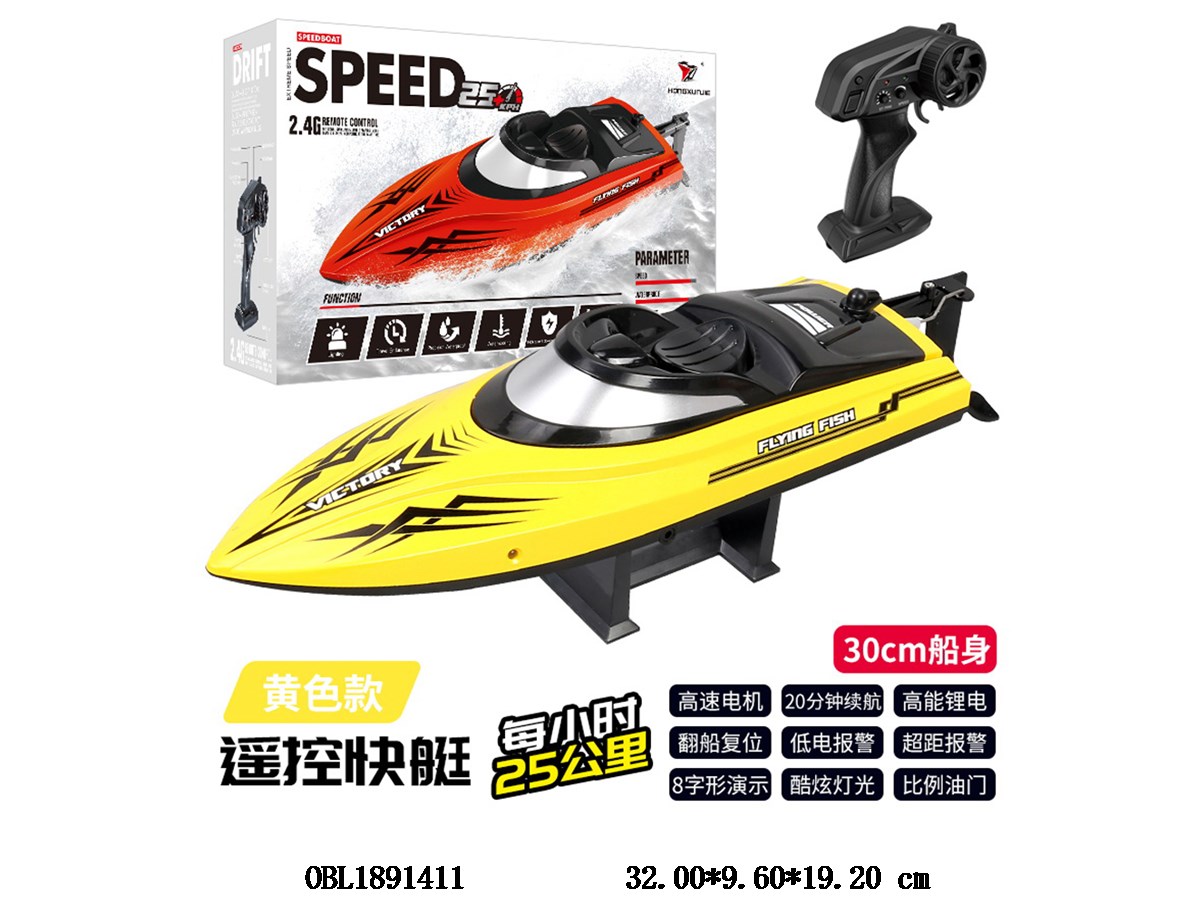 Yellow remote control high-speed speedboat with lights, one click reset for capsizing, equipped with USB cable, 7.4V lithium battery on the hull, remote control 4 * AA without power, 2.4G frequency