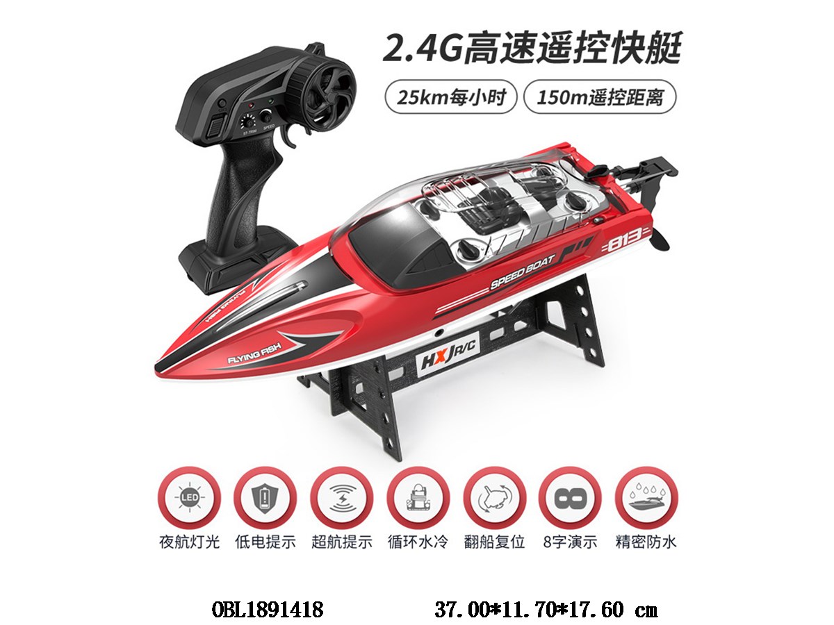 Red remote control high-speed speedboat with lights, one click reset for capsizing, equipped with USB cable, ship body 7.4V lithium battery included remote control 4 * AA, no power included, 2.4G frequency