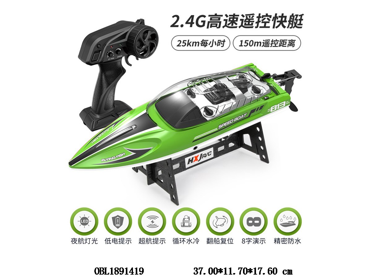 Home > R/C Boat > Green remote control high-speed speedboat with lights, one click reset for capsizing, equipped with USB cable, 7.4V lithium battery on the hull, remote control 4 * AA without power, 2.4G frequency