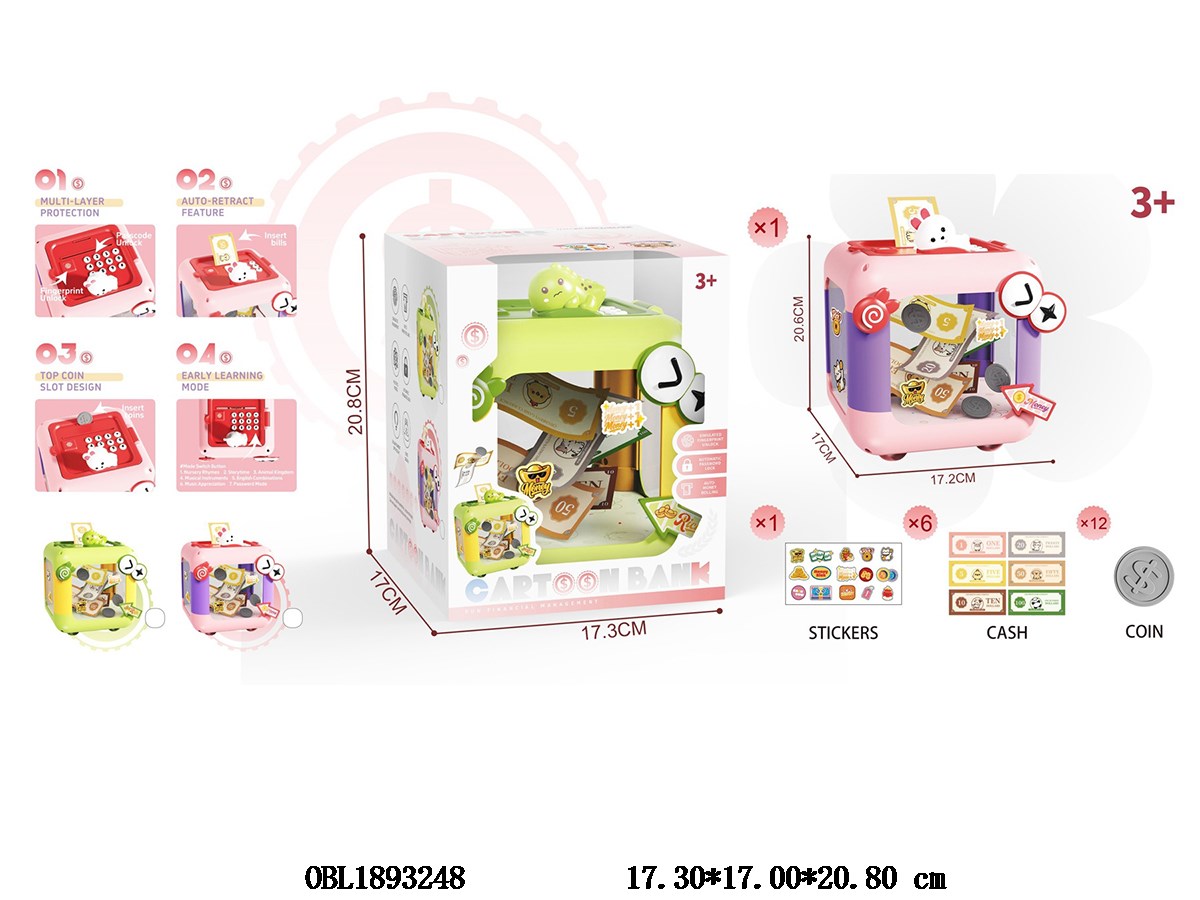Transparent cartoon piggy bank with DIY stickers/6 banknotes/12 coins