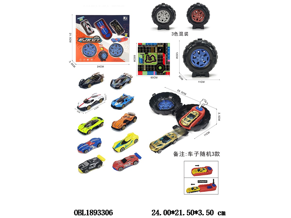 Wheel ejection toy set with 6 sliding car wheels, 3 color mixed car, 6 mixed cars