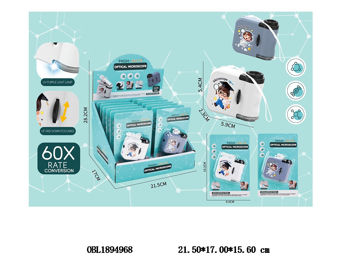 Home > Stationery > Mini portable optical microscope 60x with hanging rope, 3 * AG10 package, electric, 2-color mixed, 12 board display box