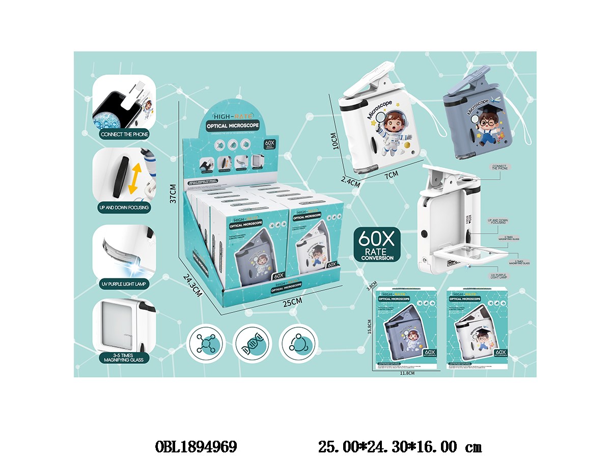 Home > Stationery > Mini portable optical microscope 60x with hanging rope 3x/5x magnifying glass 3 * AG10 package, 2-color mixed packaging, 12 board display box