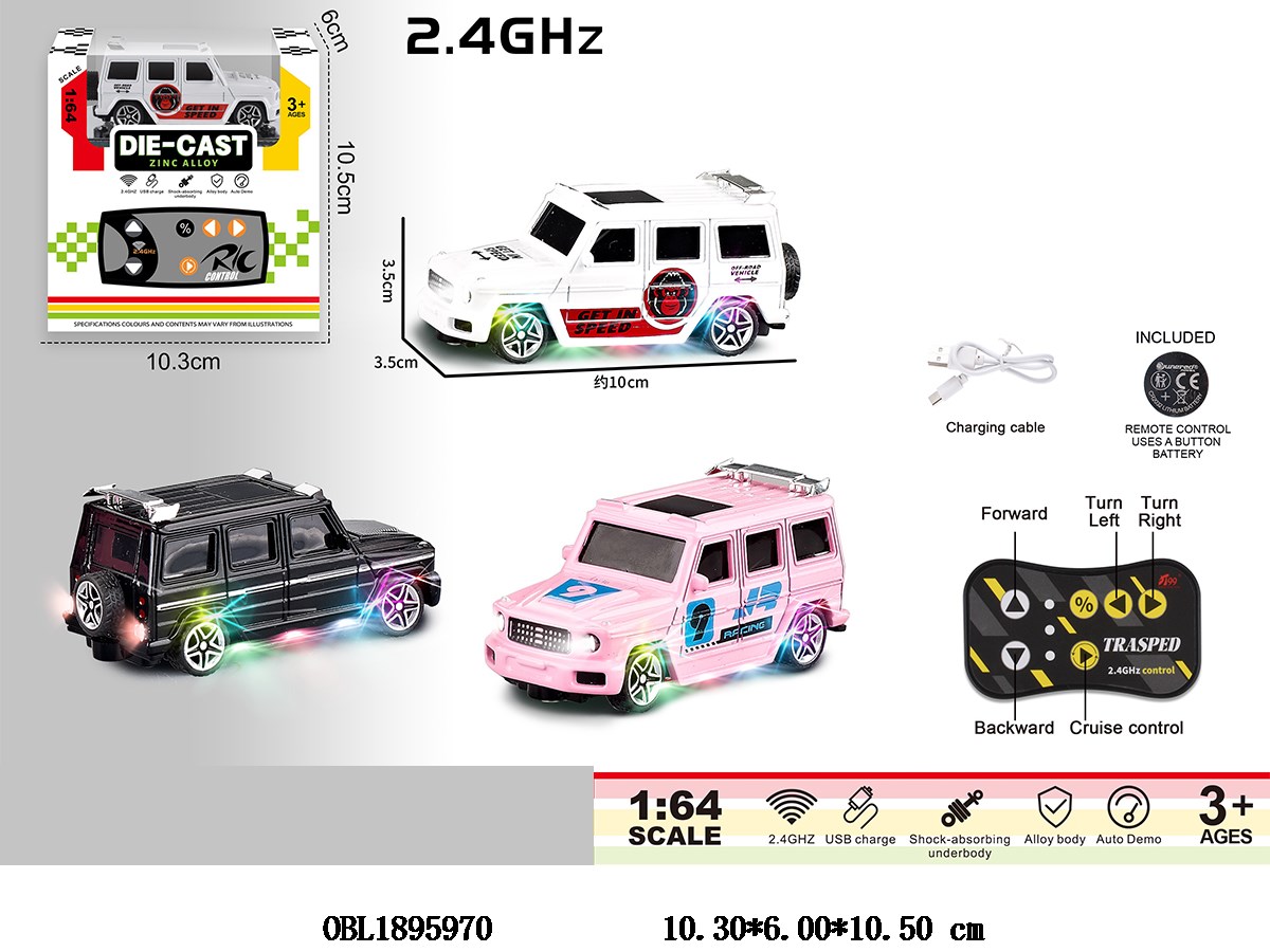 1: 64 alloy remote control car with lights and USB cable, body lithium battery pack remote control 1 * CR2032 pack power, 2.4G frequency, 3-color hybrid