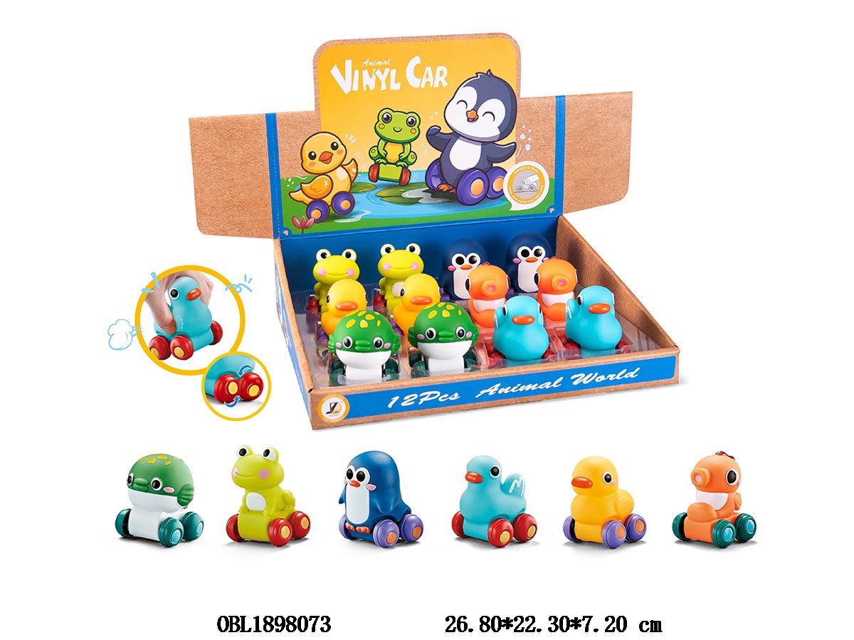 Sliding rubber animal car 6 mixed models, 12 pieces per display box