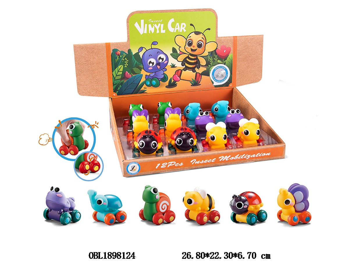 Sliding rubber animal car 6 mixed models, 12 pieces per display box