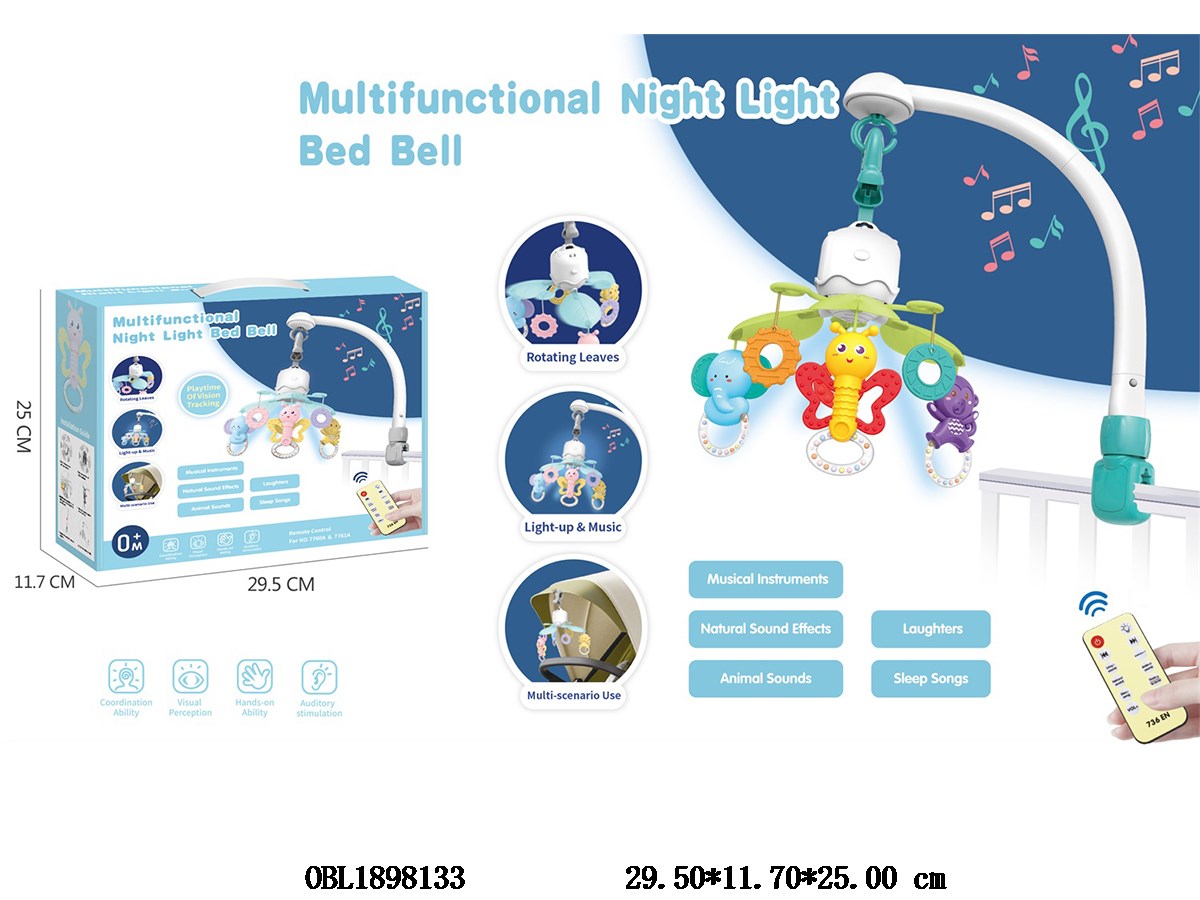 Baby remote control rotating bedside bell with light, music, 3 * AAA, no power included. Remote control 1 * CR2025, power included