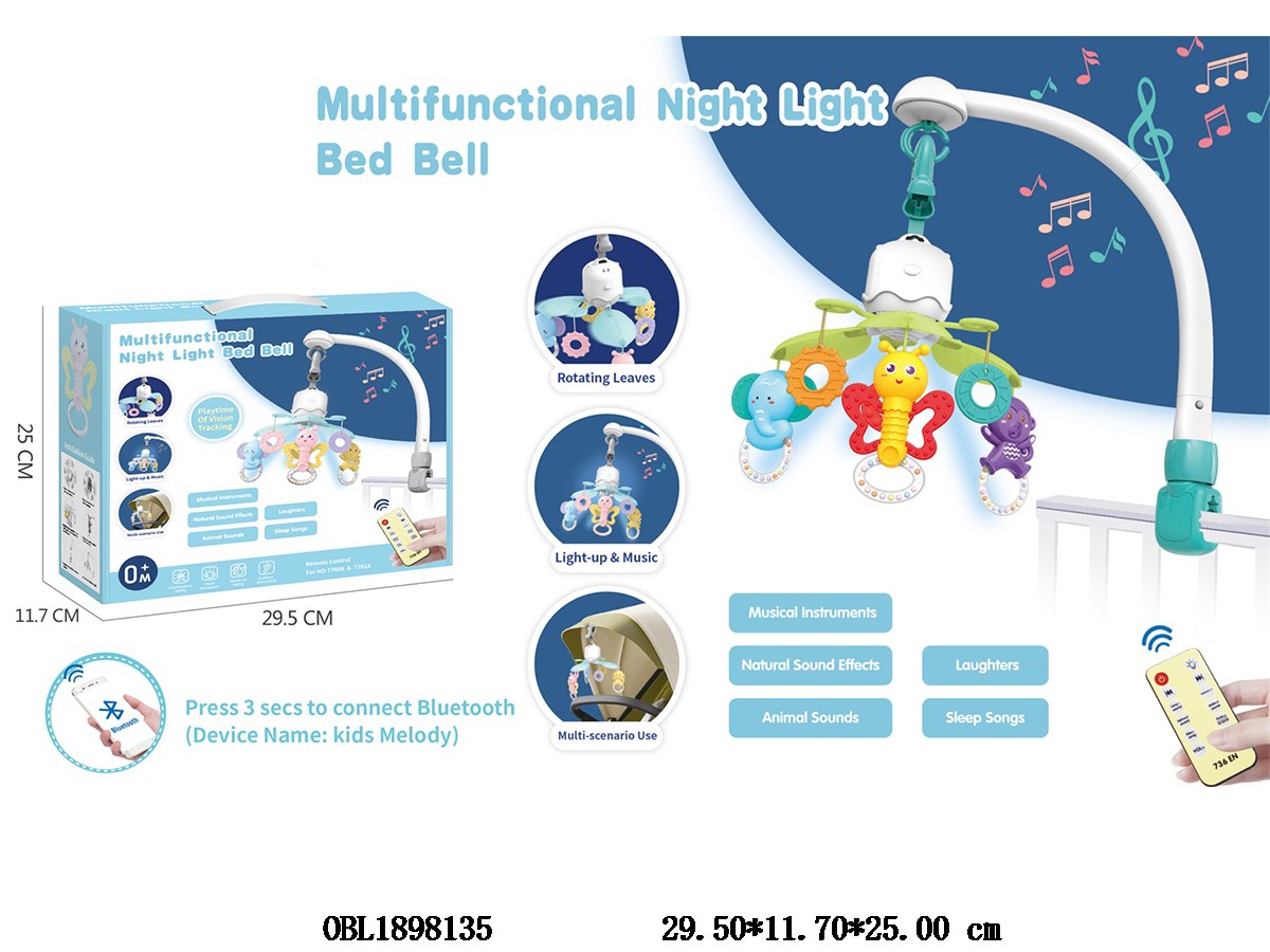 Baby remote control rotating Bluetooth bedside bell with light, music, 3 * AAA, no power included, remote control 1 * CR2025, power included