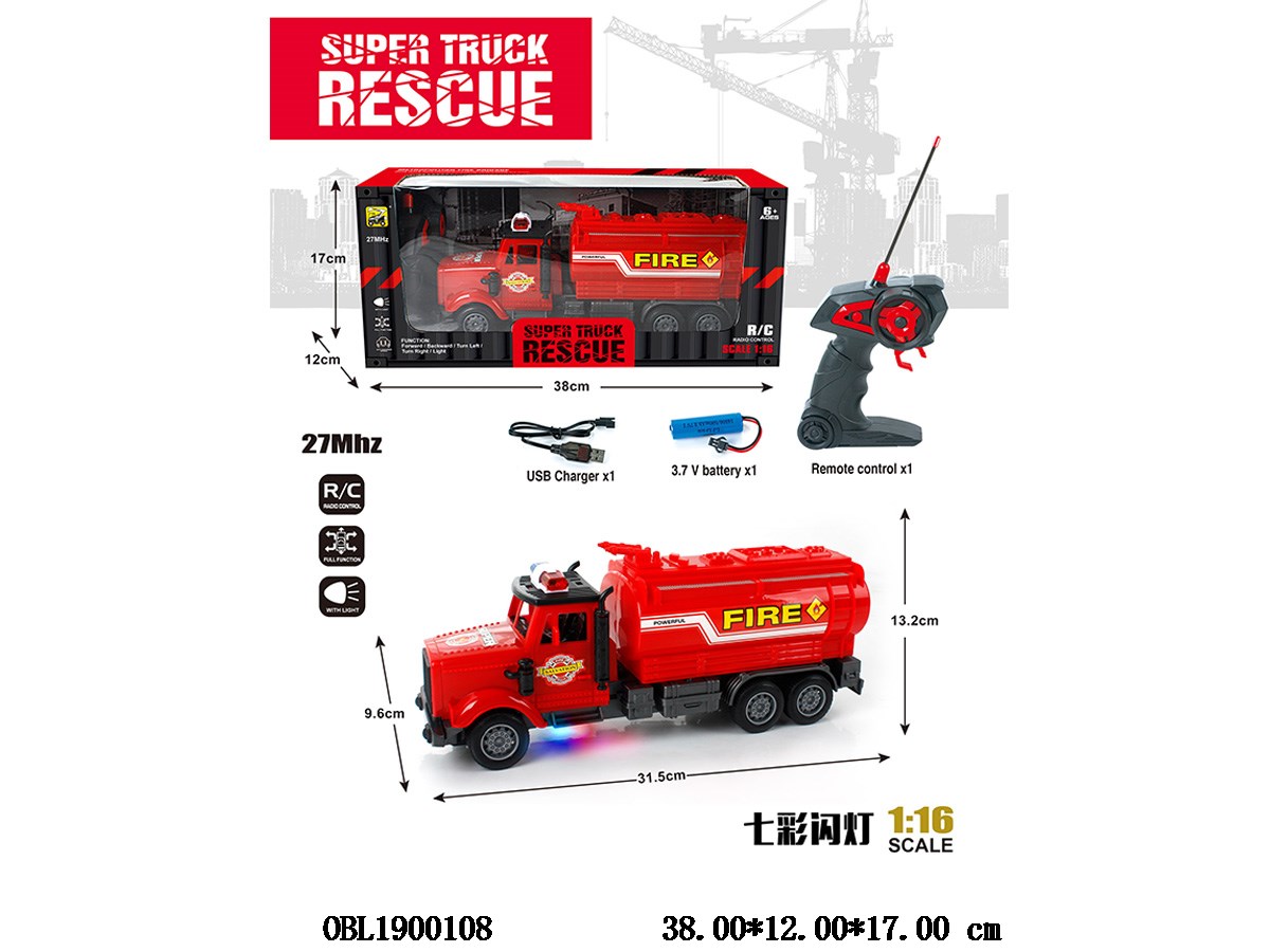 Home > R/C Car > Four way remote control fire truck with lights and USB cable, body 3.7V lithium battery with power included remote control 2 * AA, no power included, 27 frequency