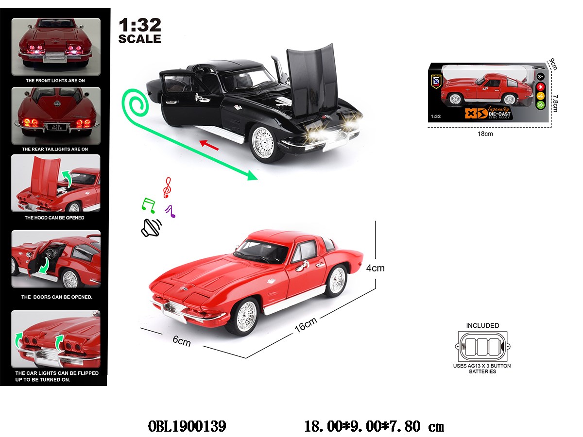 1: 32 die cast zinc alloy regenerative car with lighting and sound effects that can open the door, 3 * AG13 package with electricity and 2 colors mixed