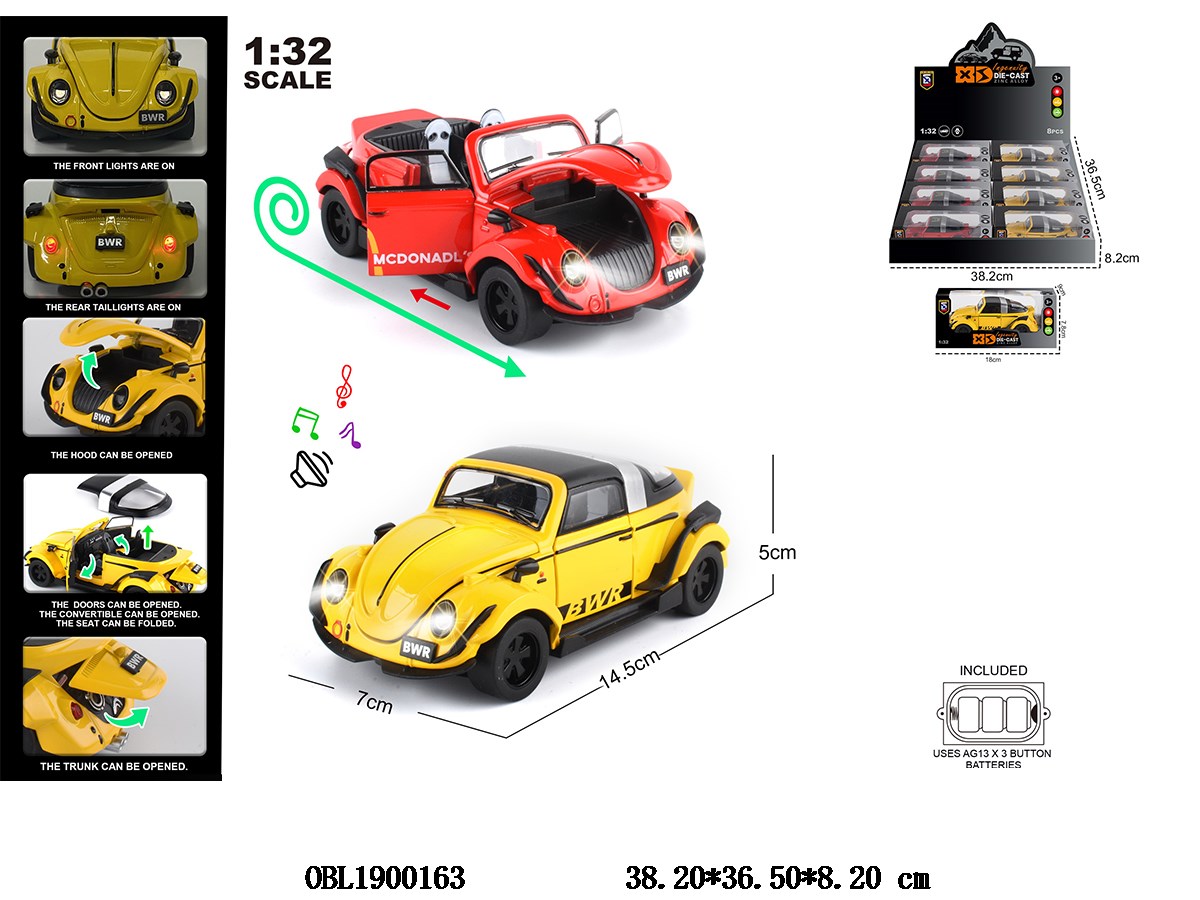 1: 32 die cast zinc alloy regenerative car with lighting and sound effects, capable of opening doors, 3 * AG13 electric package, 2 colors mixed, 8 pieces per display box
