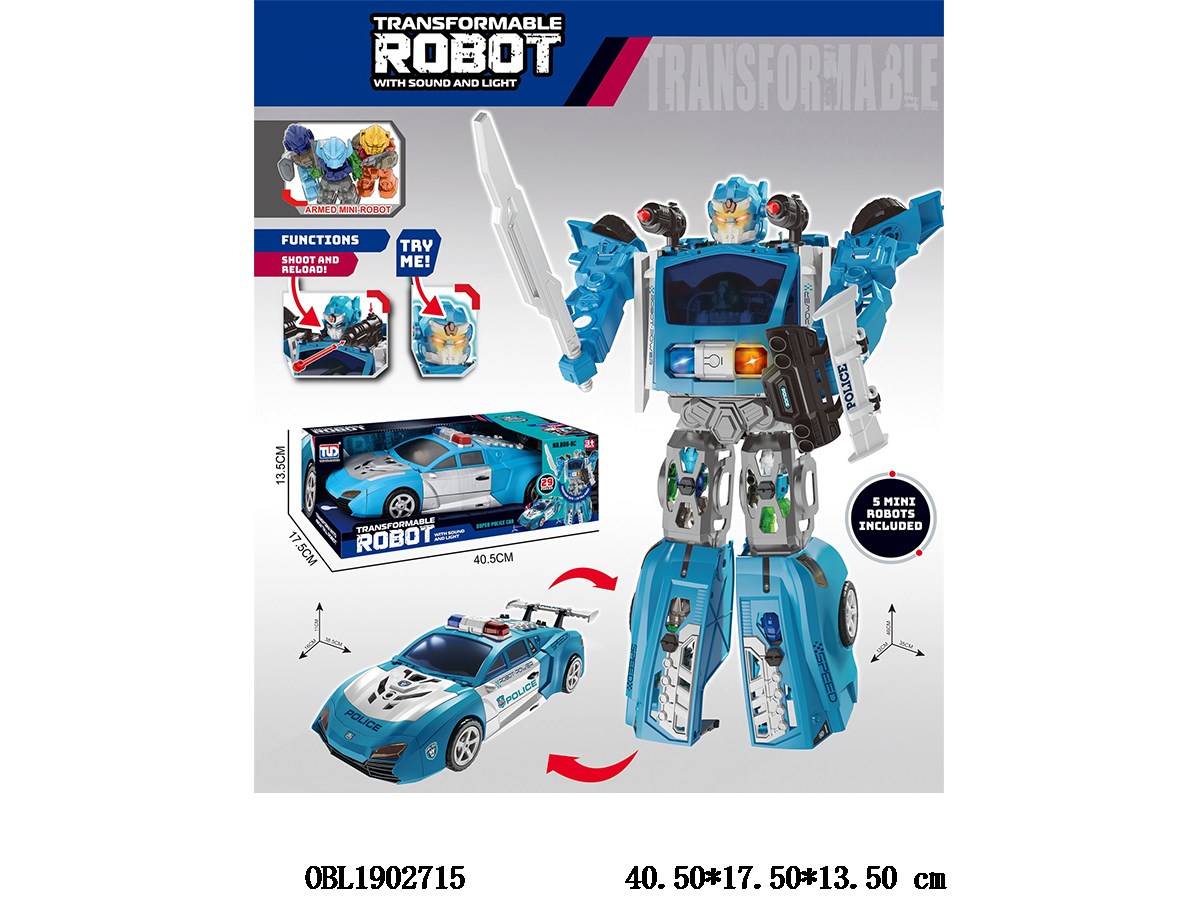 Transformed police car with lights, sound, 5 small robots, total 4 * AG13, power included