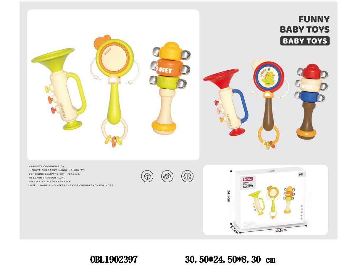 3-piece set of drum/bell/horn set, mixed in 2 colors