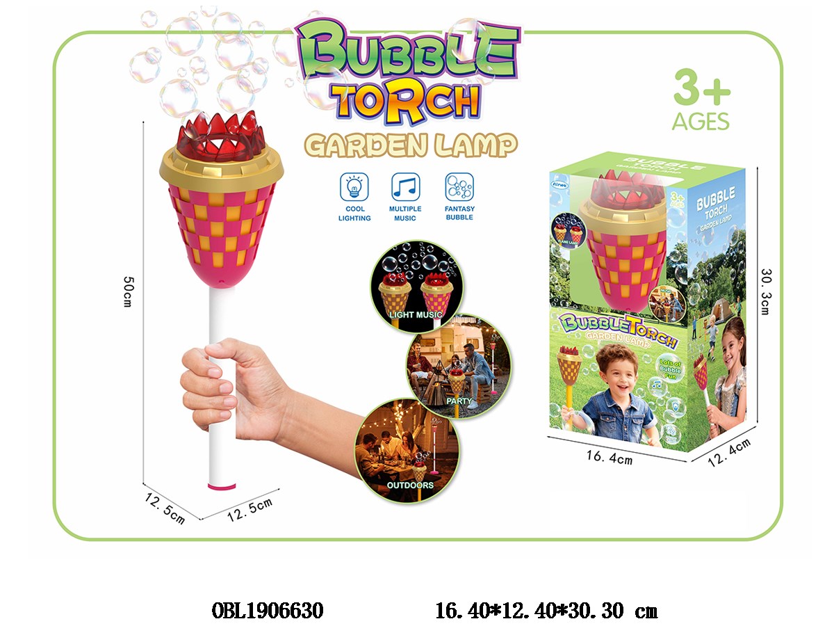 Red flame light handheld torch bubble machine with music and 100ml bubble water 3 * AA, no electricity included