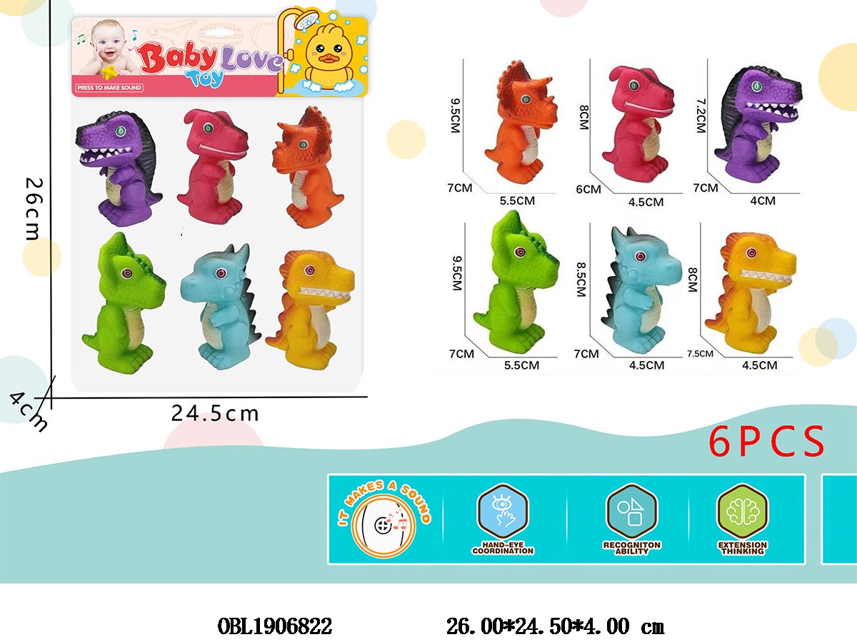 6 bathroom mounted water splashing rubber dinosaur with BB whistle