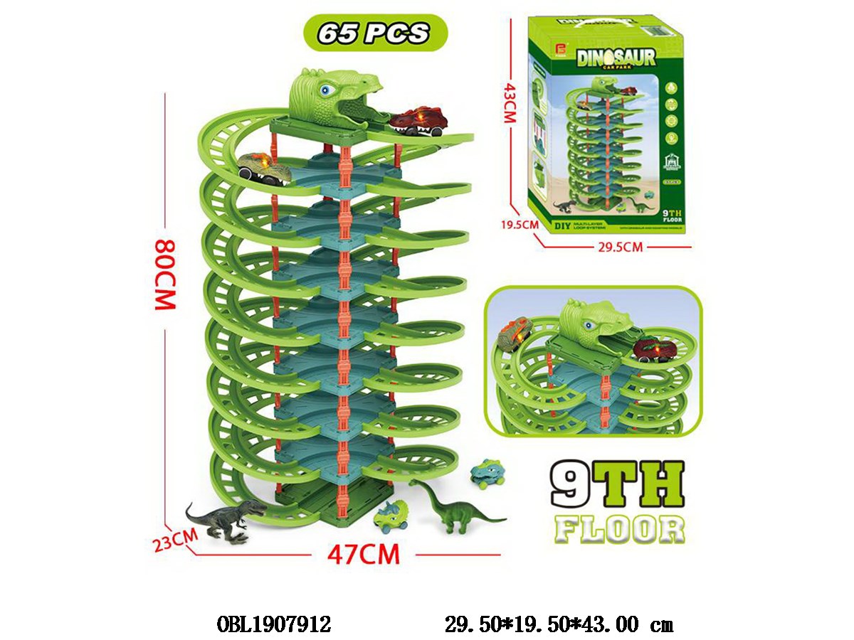 Self installed track parking lot set with 2 electric dinosaur cars, each 2 * AAA, not including electric dinosaur cars. 4 random models available