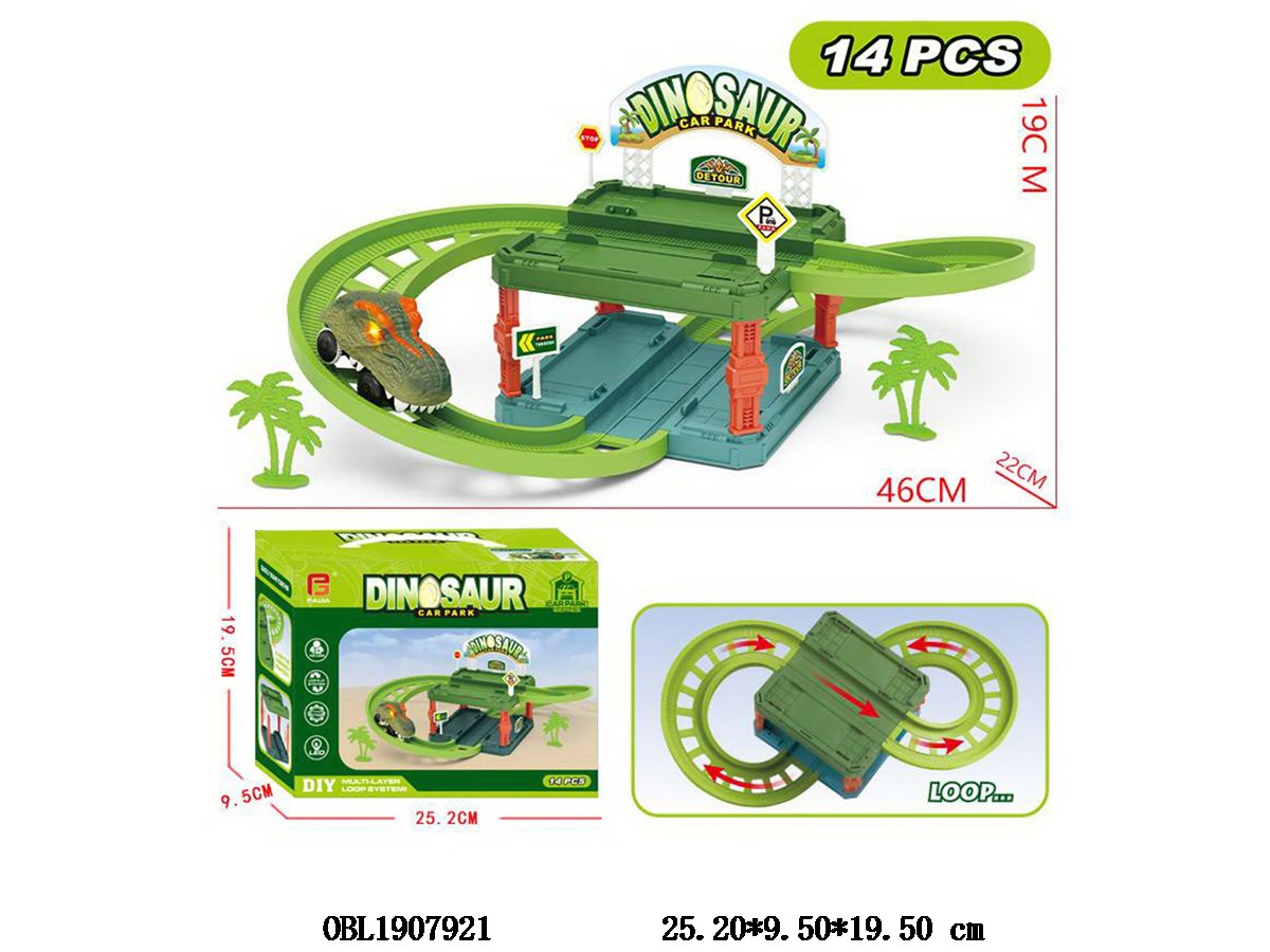 Self installed track parking lot set with 1 electric dinosaur car, 2 * AAA non electric dinosaur cars, 2 random models
