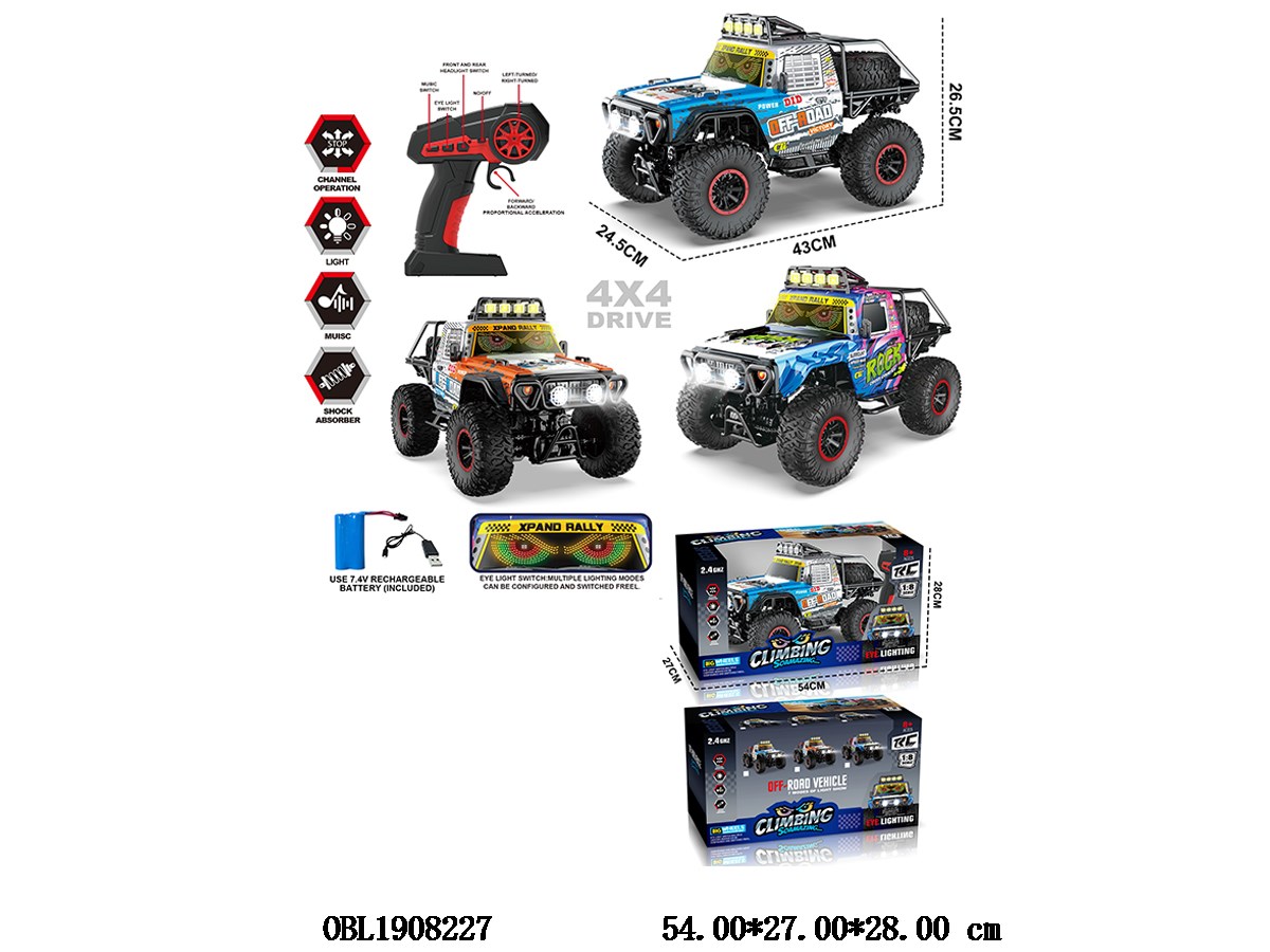 Home > R/C Car > 1: 8 four-wheel drive remote control climbing car with lights, music, and USB cable. 7.4V lithium battery included remote control 2 * AA without power, 2.4G frequency, 3 colors mixed