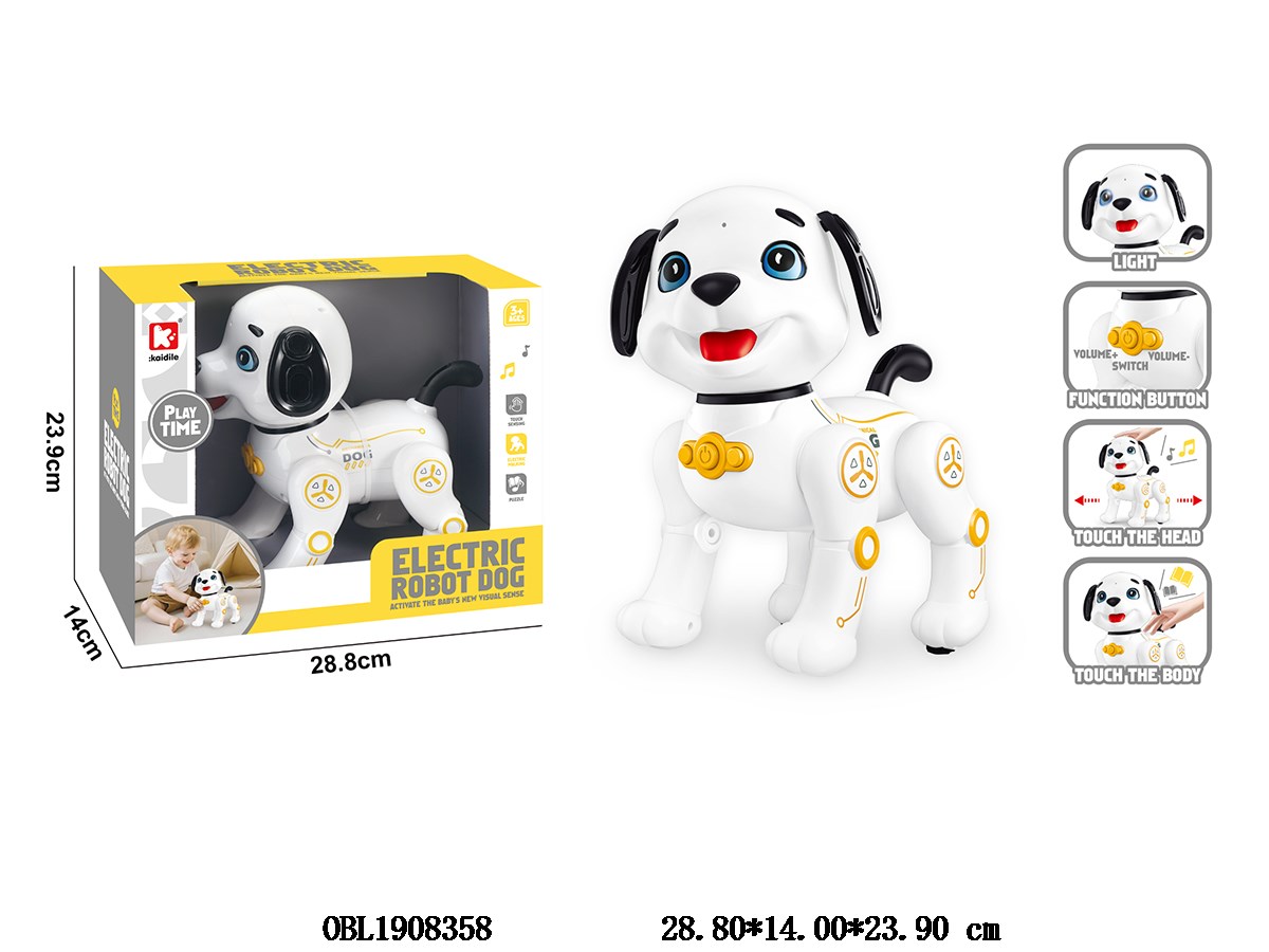 White print yellow intelligent electric dog with light, music, touch and USB cable 3.7V lithium rechargeable battery pack