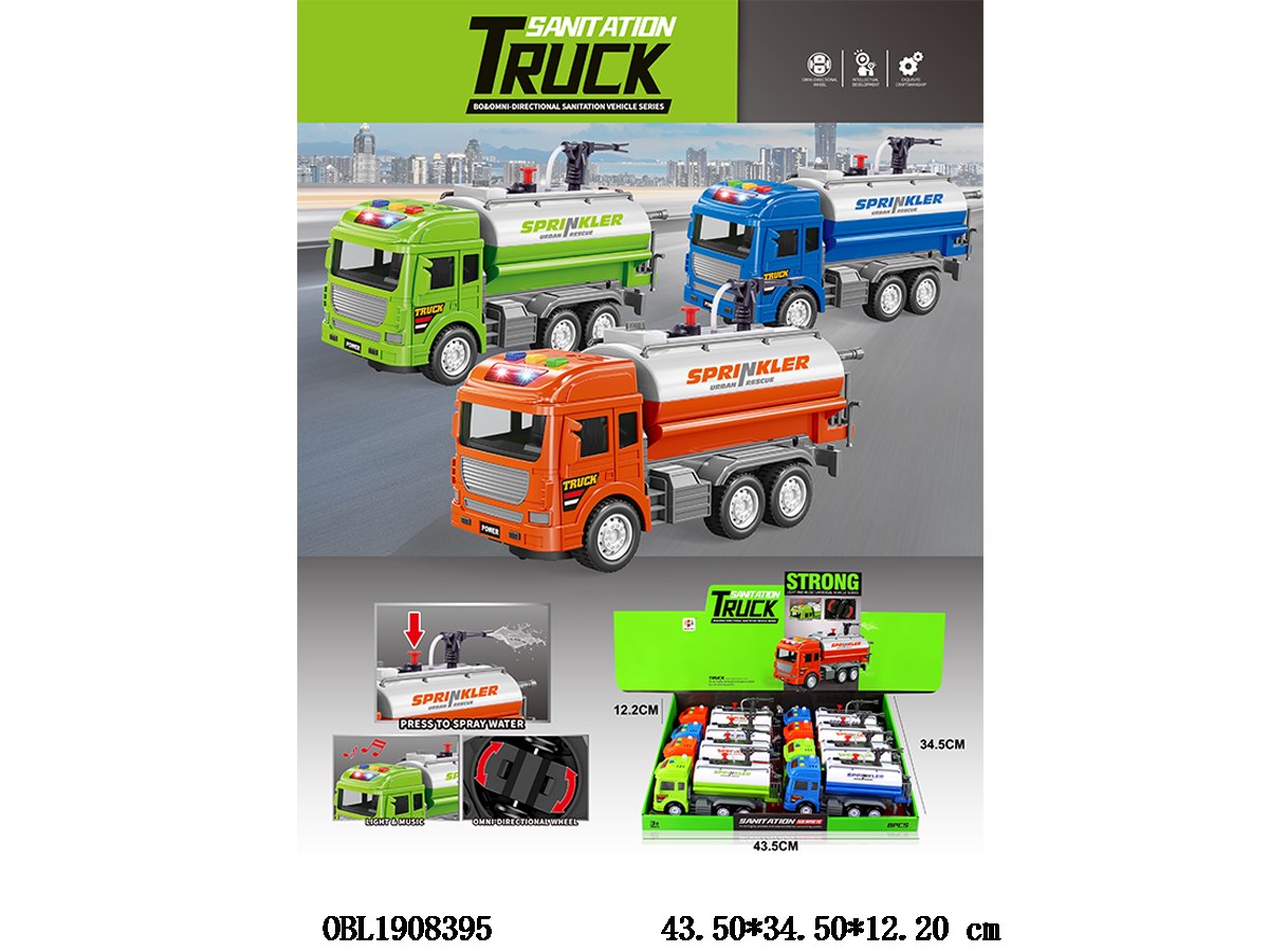 Electric universal sprinkler truck with lighting and sound, body 2 * AA, not including trolley head 3 * AG13, including electricity, 3 colors mixed, 8 pieces per display box