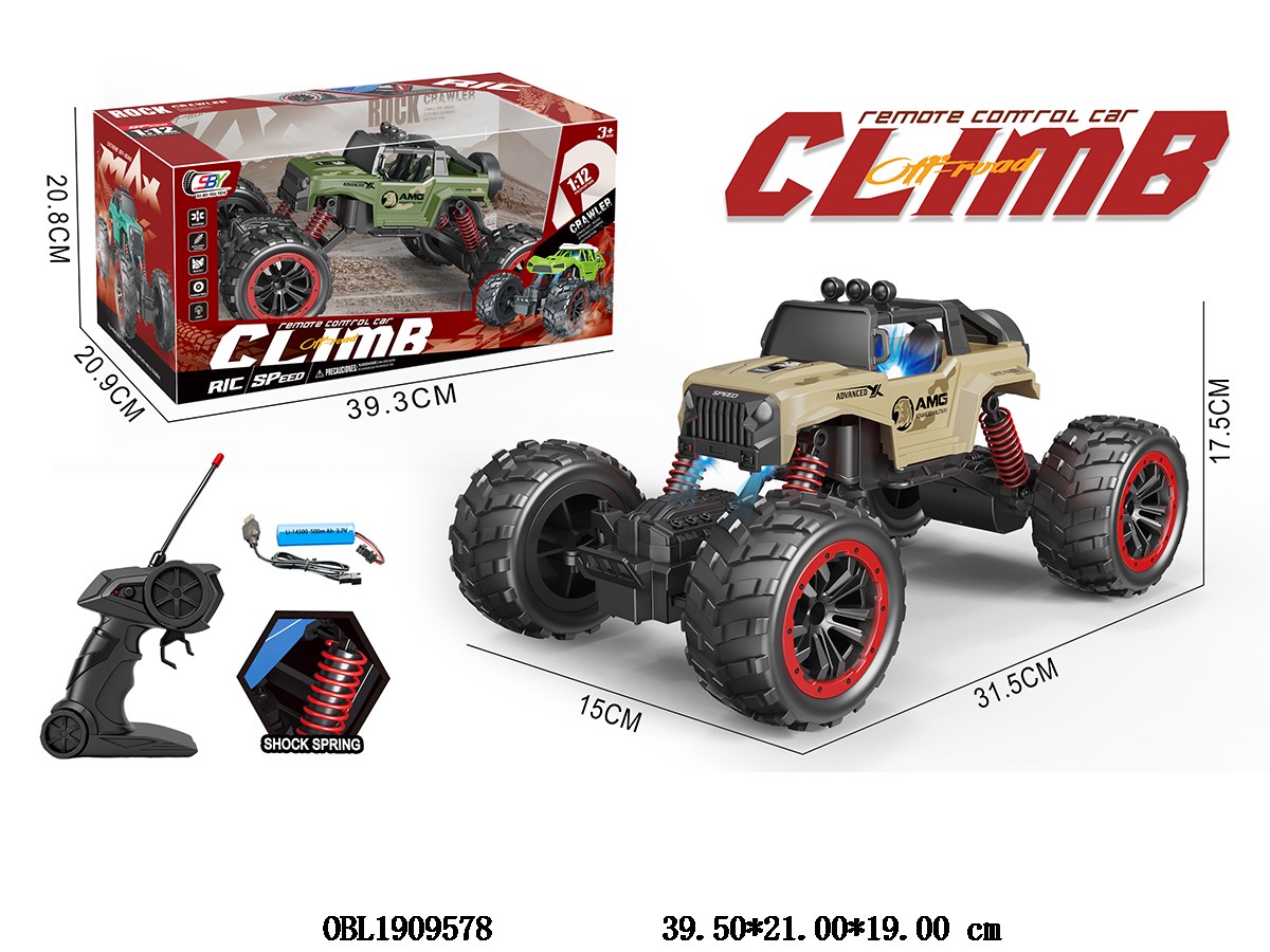 1: 12 Four way remote control climbing car with lights and USB cable. Body 3.7V lithium battery with power included remote control 2 * AA without power included. 27 frequency, 2 color mixed