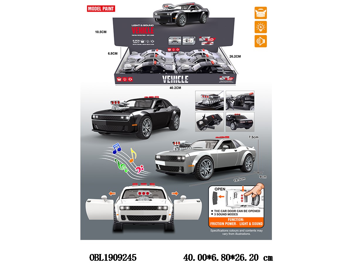 Home > F/P Car > Inertial car with lighting and music, can open door 3 * AG13, including electricity, 3 colors mixed, 6 pieces, 1 display box