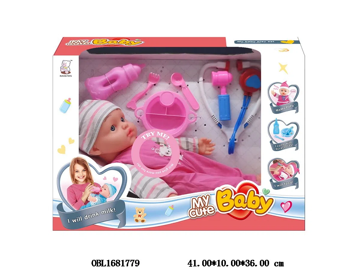 首页 > 带IC芭芘公仔 > 16寸搪胶公仔套装带IC 3*AG13包电 主体衣服2色混装