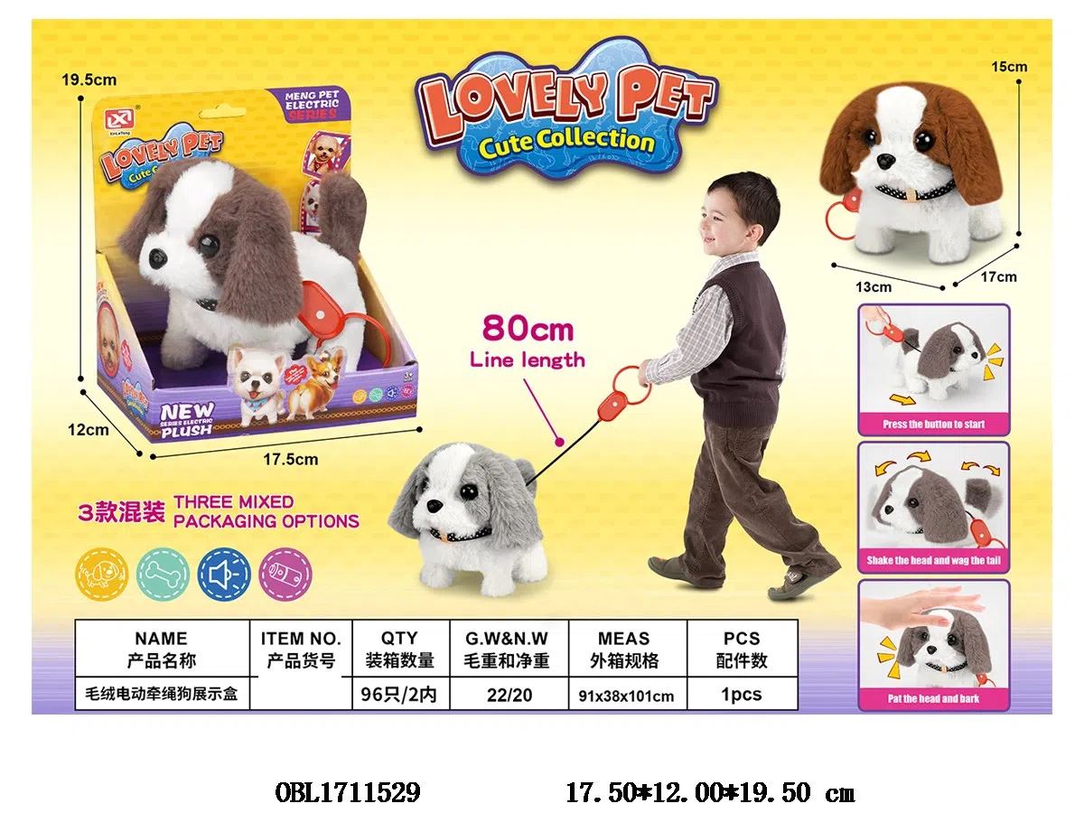 毛绒电动狗带声音 可牵绳 3色混装 2*AA不包电