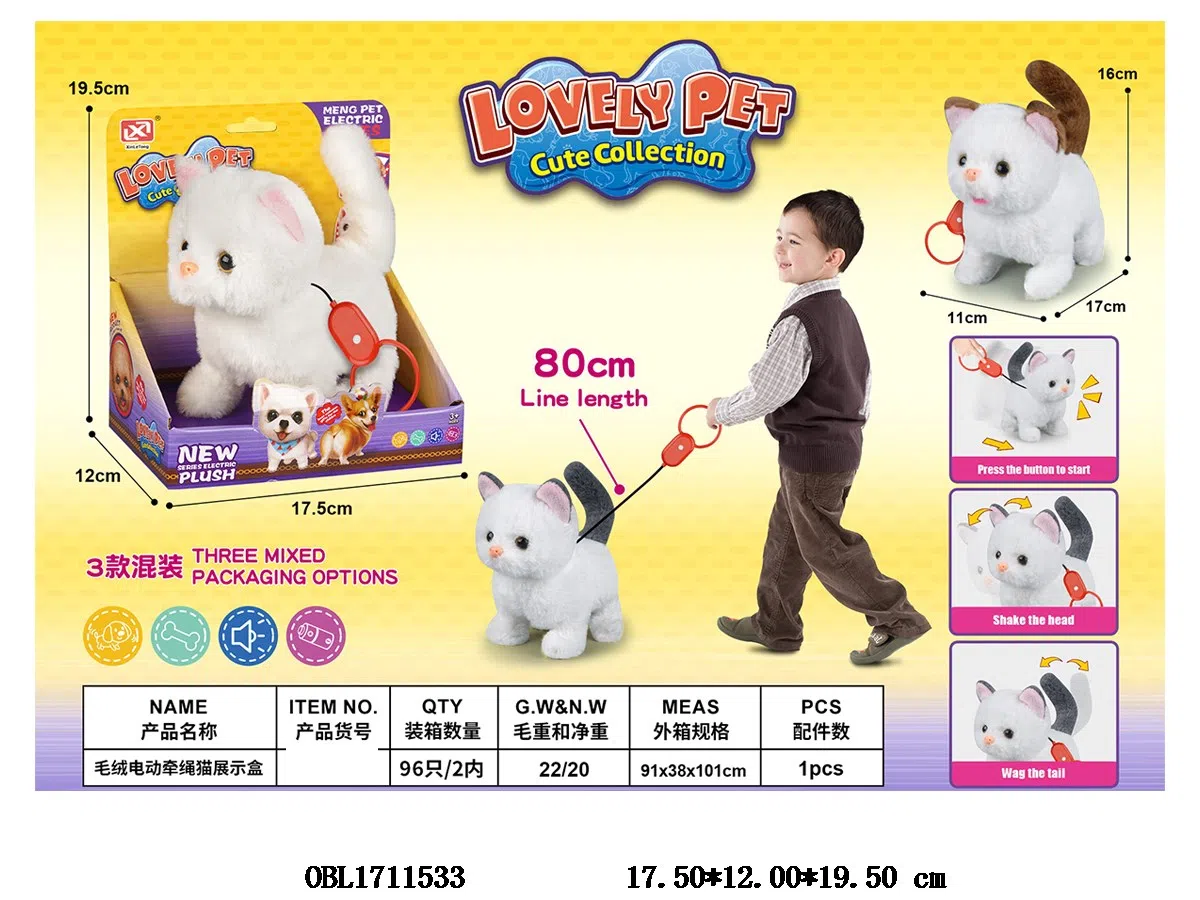 毛绒电动猫带声音 可牵绳 3色混装 2*AA不包电