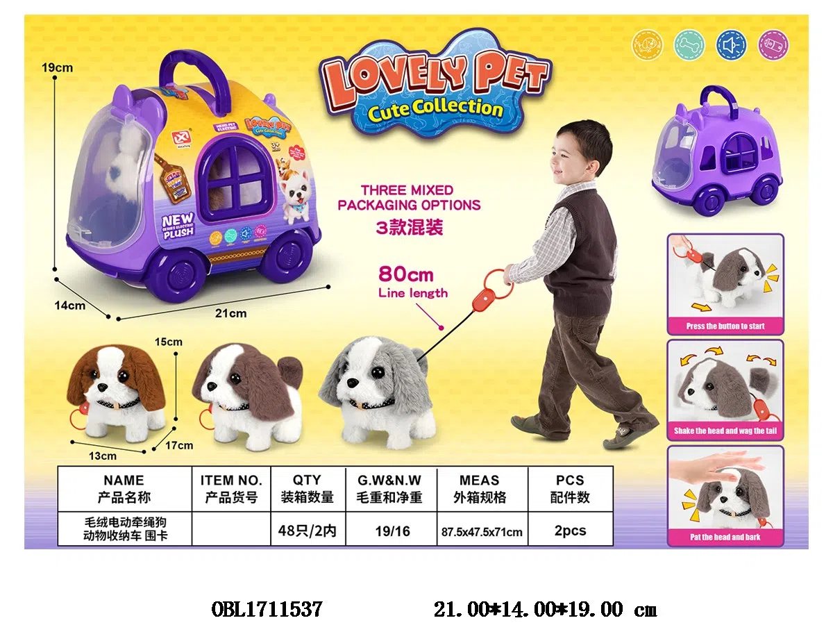 毛绒电动狗带声音配收纳笼子车 可牵绳 2*AA不包电 3色混装 围卡