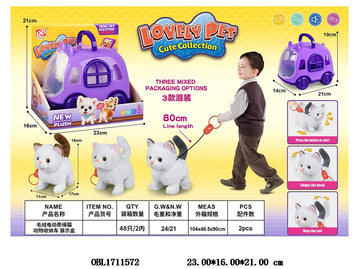 毛绒电动猫带声音配收纳笼子车 可牵绳 2*AA不包电 3色混装