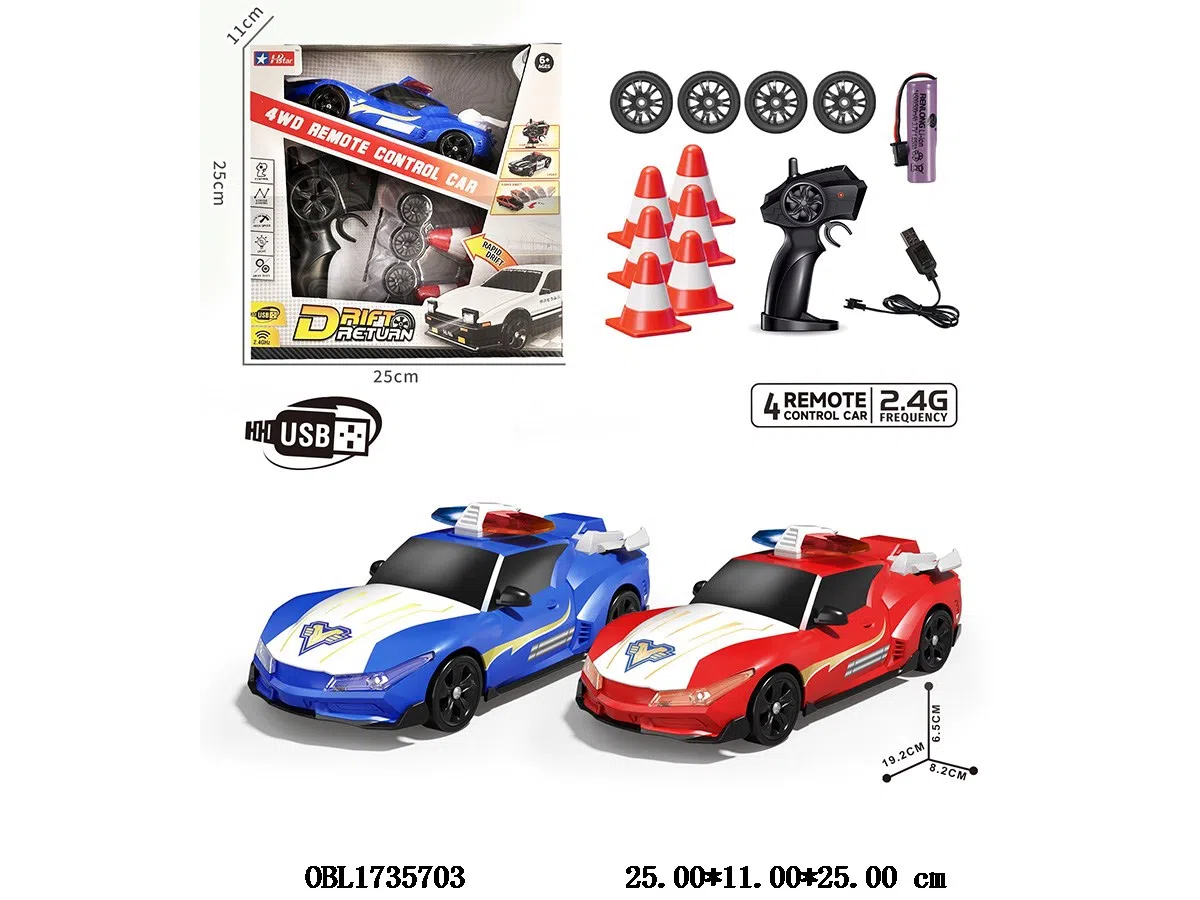 四通遥控警车套装带灯光声音漂移 配USB线 车身3.7V锂电池包电 遥控器2*AA不包电 2.4G频率 2色混装