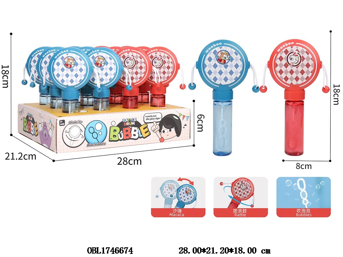 首页 > 泡泡棒 > 拨浪鼓沙锤泡泡棒 50ml 12支装一展示盒 2色混装