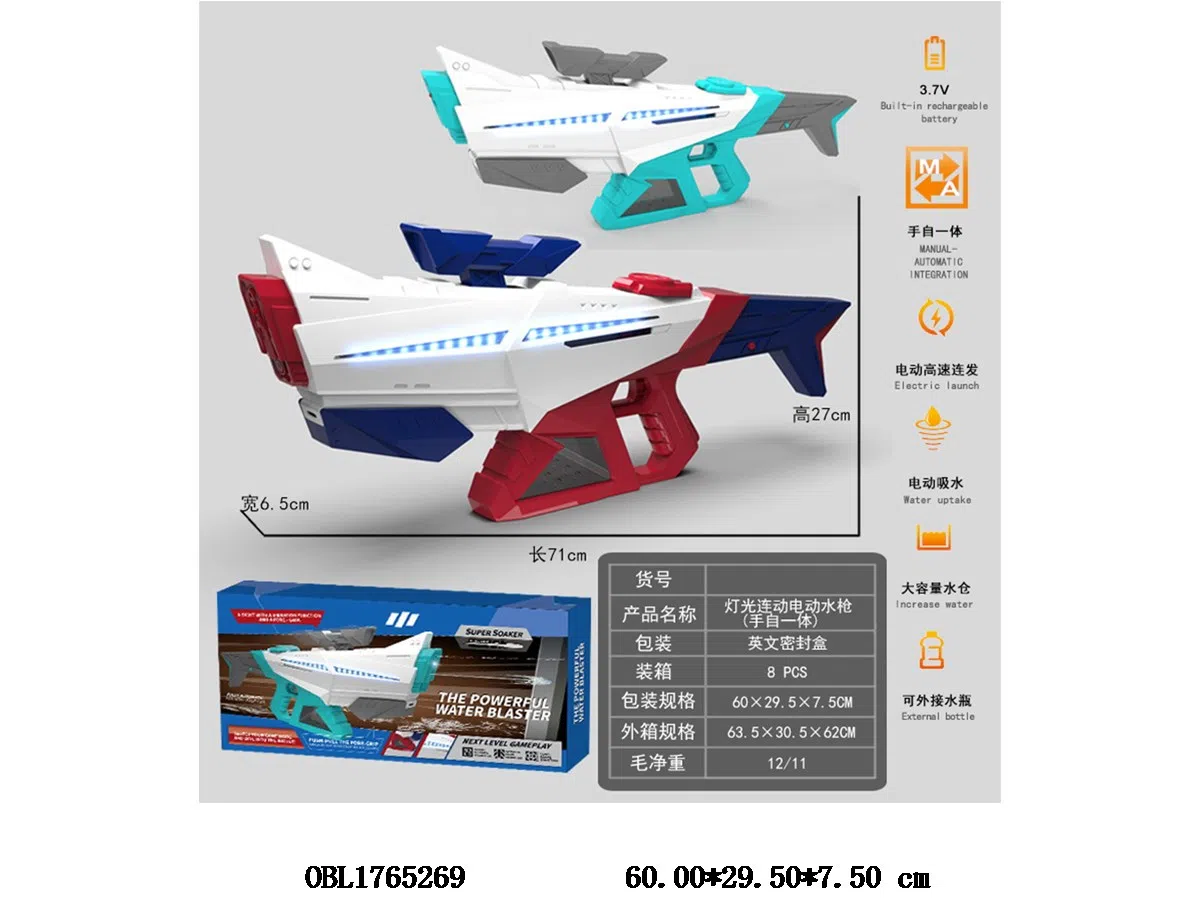 首页 > 水枪 > 手自一体连动电动水枪带灯光配USB充电线 1000ML 3.7V锂电池包电 2色混装