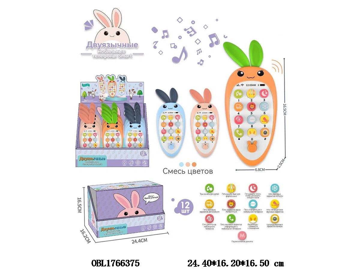 俄文版益智早教手机带灯光音乐 2*AAA不包电 12只装一展示盒 3款混装