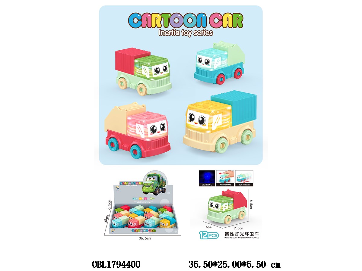 惯性环卫车带灯光 2*AG3包电 2款4色混装 12只装一展示盒